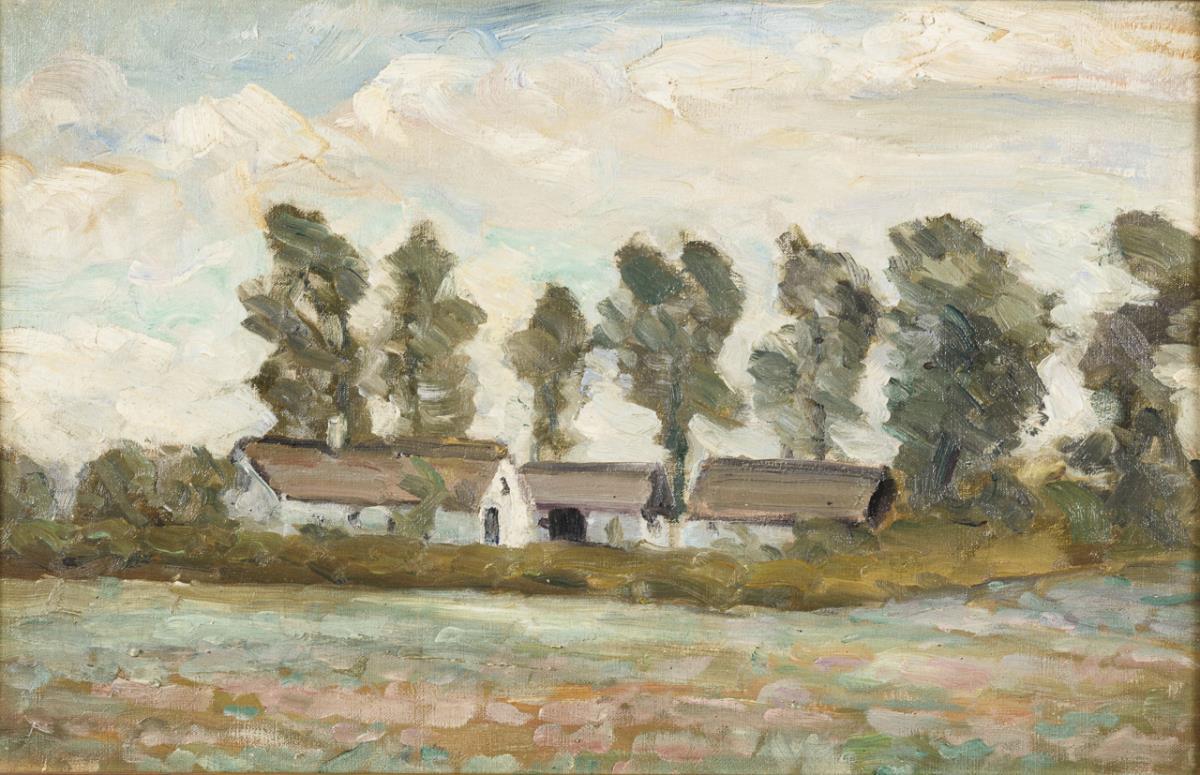 Impressionistisch gemalte flache Landschaft mit den Häusern vor Pappeln. Eine restaurierte Stelle mit Hinterklebung.