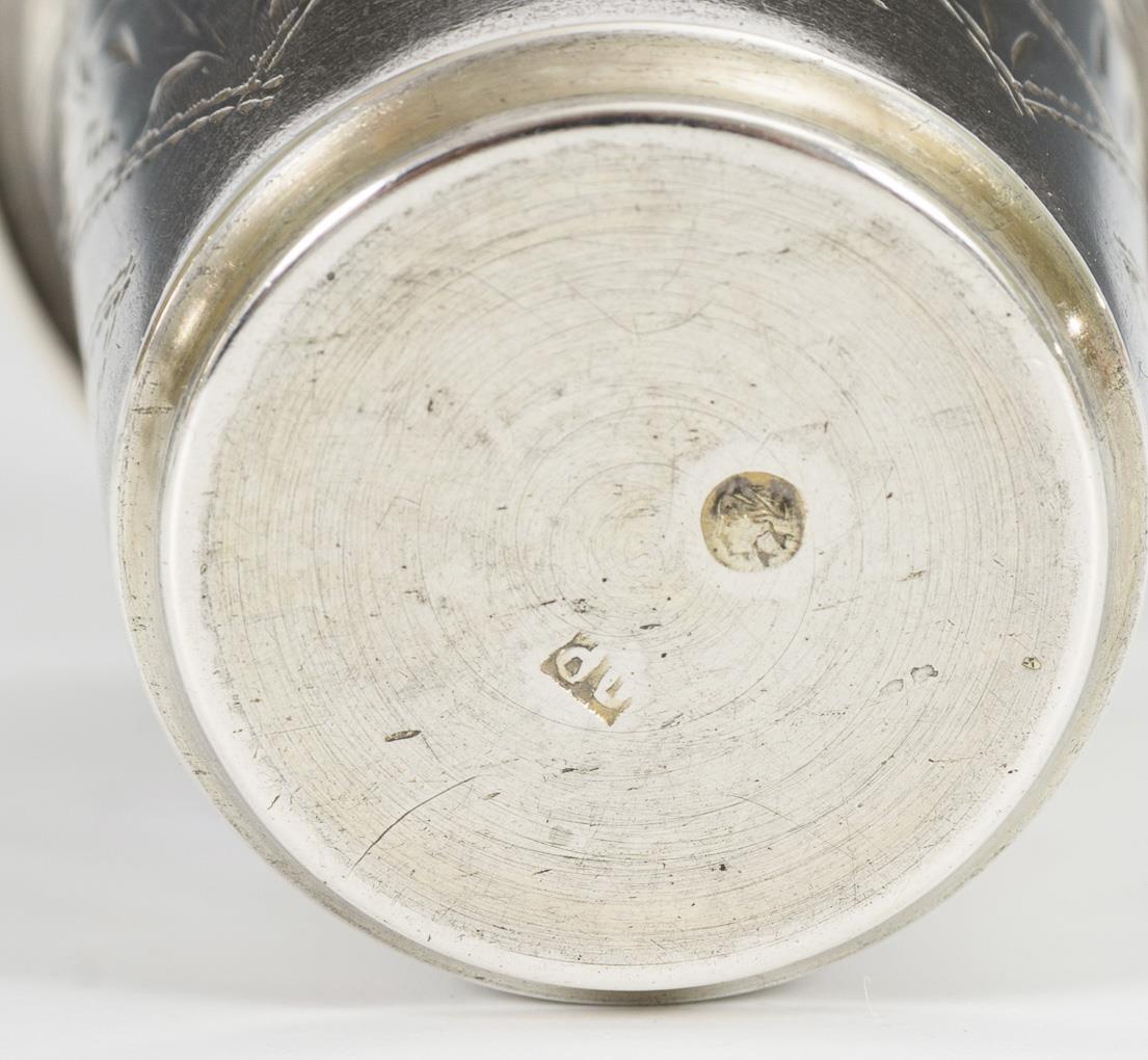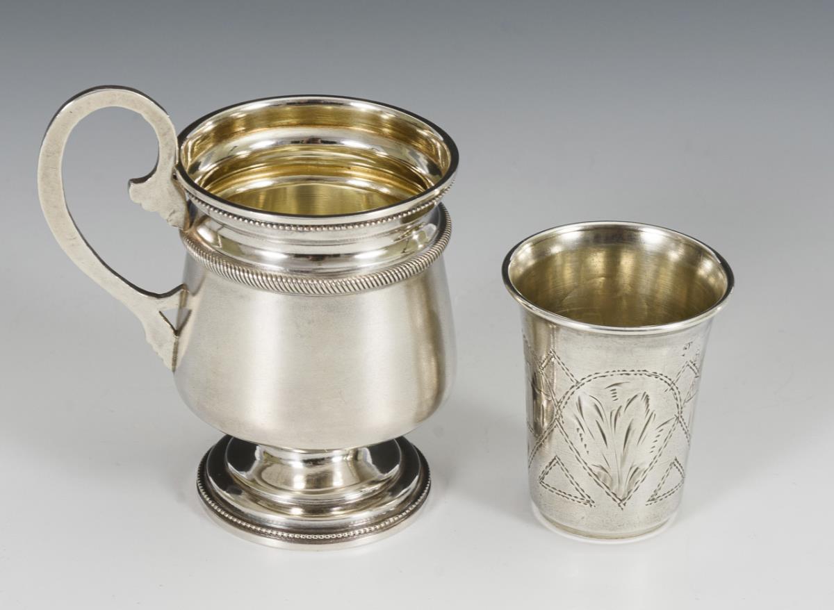 Henkelbecher mit Innenvergoldung und Monogrammgravur "MH". / Kleiner Schnapsbecher mit gravierten Architekturmotiven. Schnapsbecher mit kleinem Wandungsdefekt.