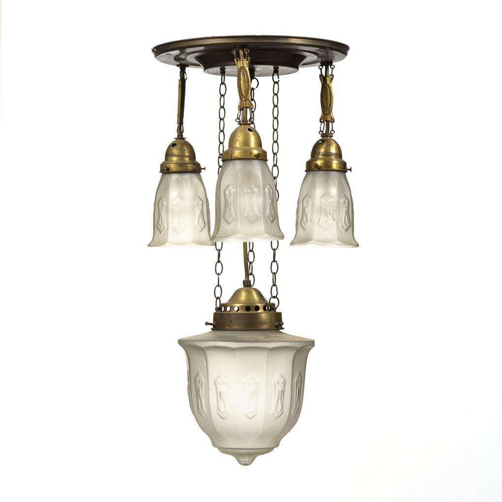 4-flammige Hängelampe mit glockenförmigem Mittelschirm an 3-facher Kettenaufhängung und Tellerbaldachin, umgeben von 3 kleinen hängenden Glockenschirmen mit stiltypischem Dekor. Alters-/Gebrauchsspuren.