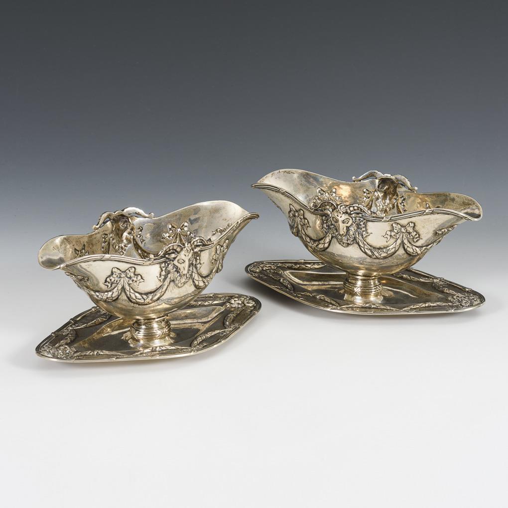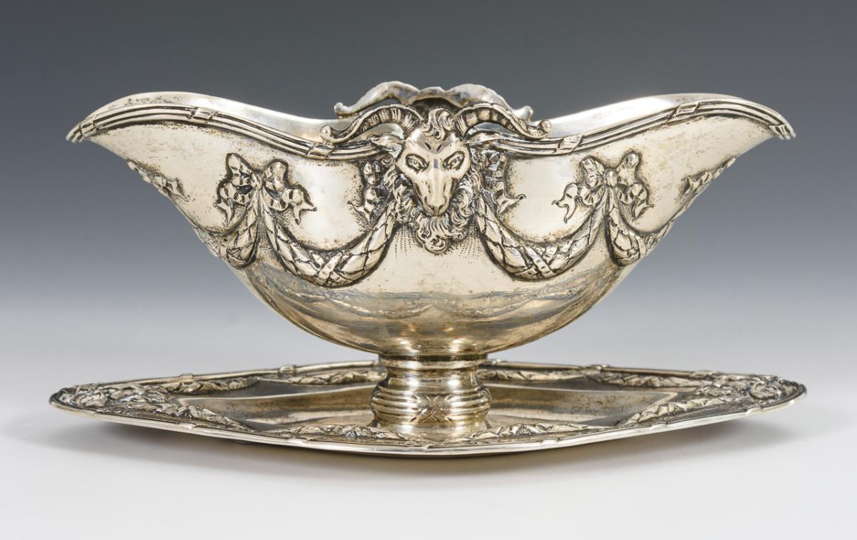 Elegante, mit Widderköpfen und Girlanden reliefierte Saucieren.
