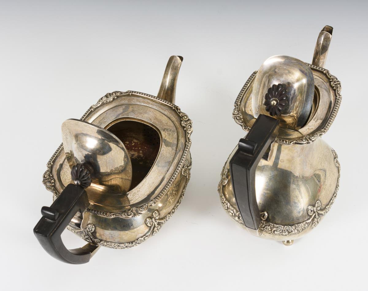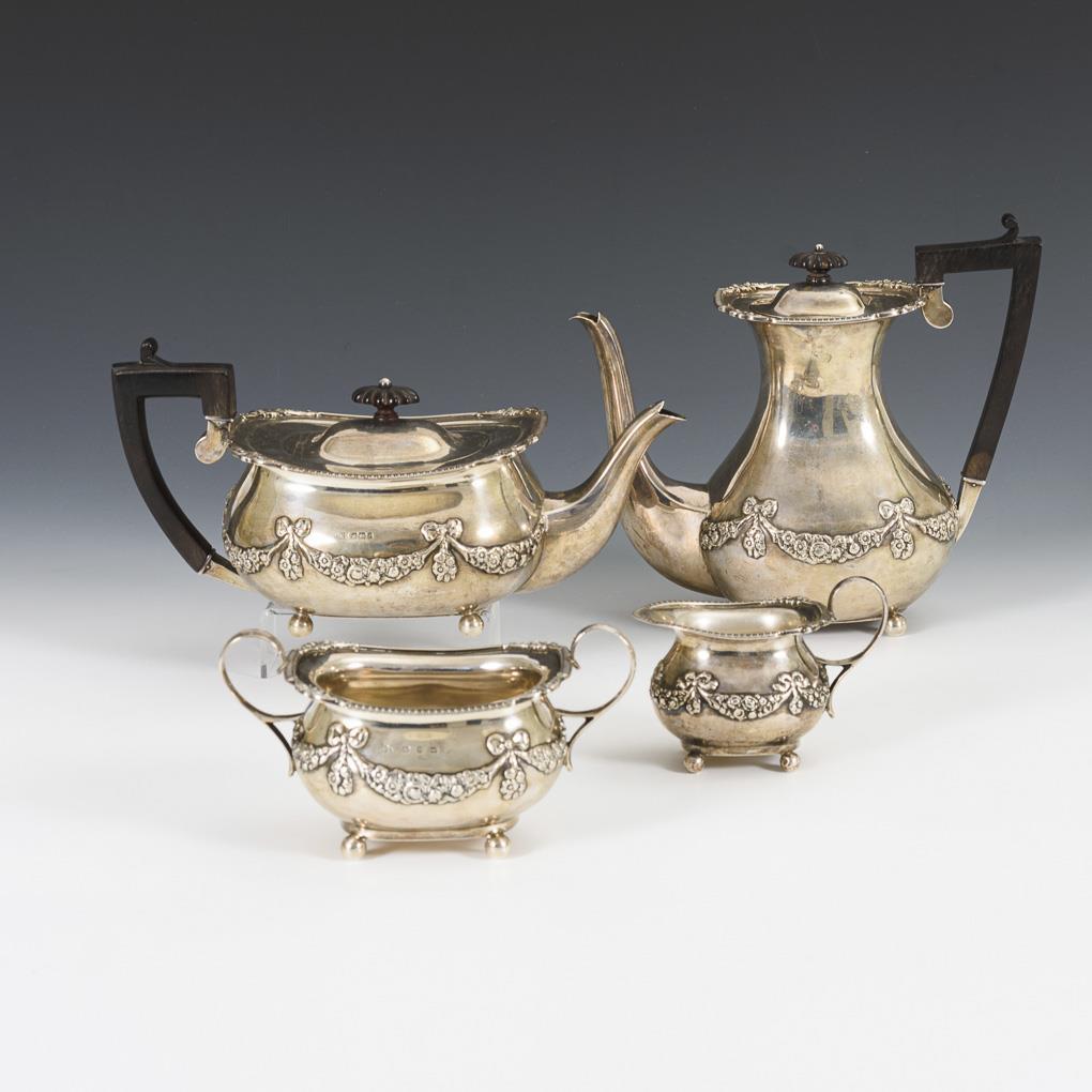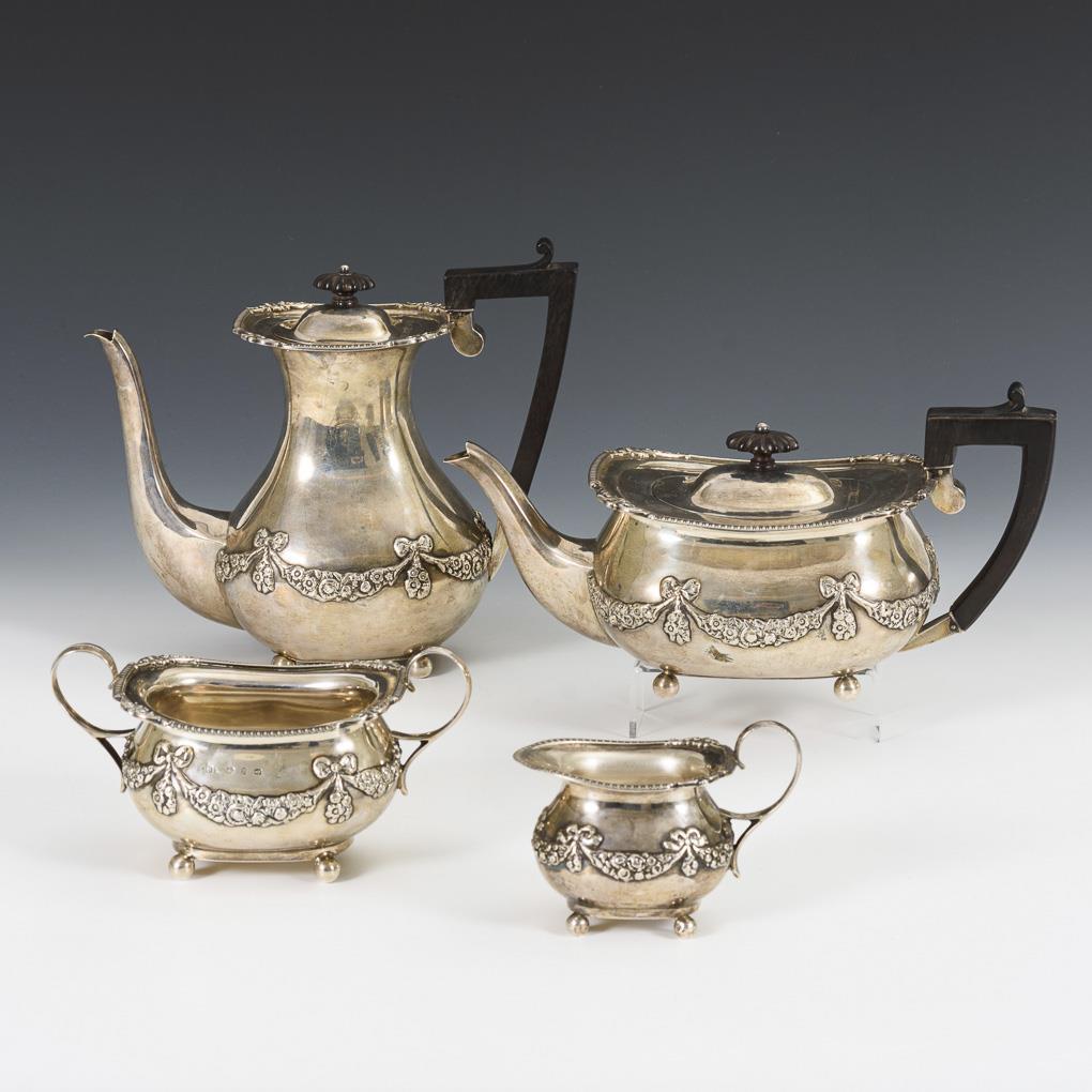 Bauchige Form mit reliefierten Blütengirlanden und Holzgriffen: Kaffeekanne, Teekanne, Zuckerschale, Milchgießer. Kugelfüße der Kaffeekanne etwas gedellt.
