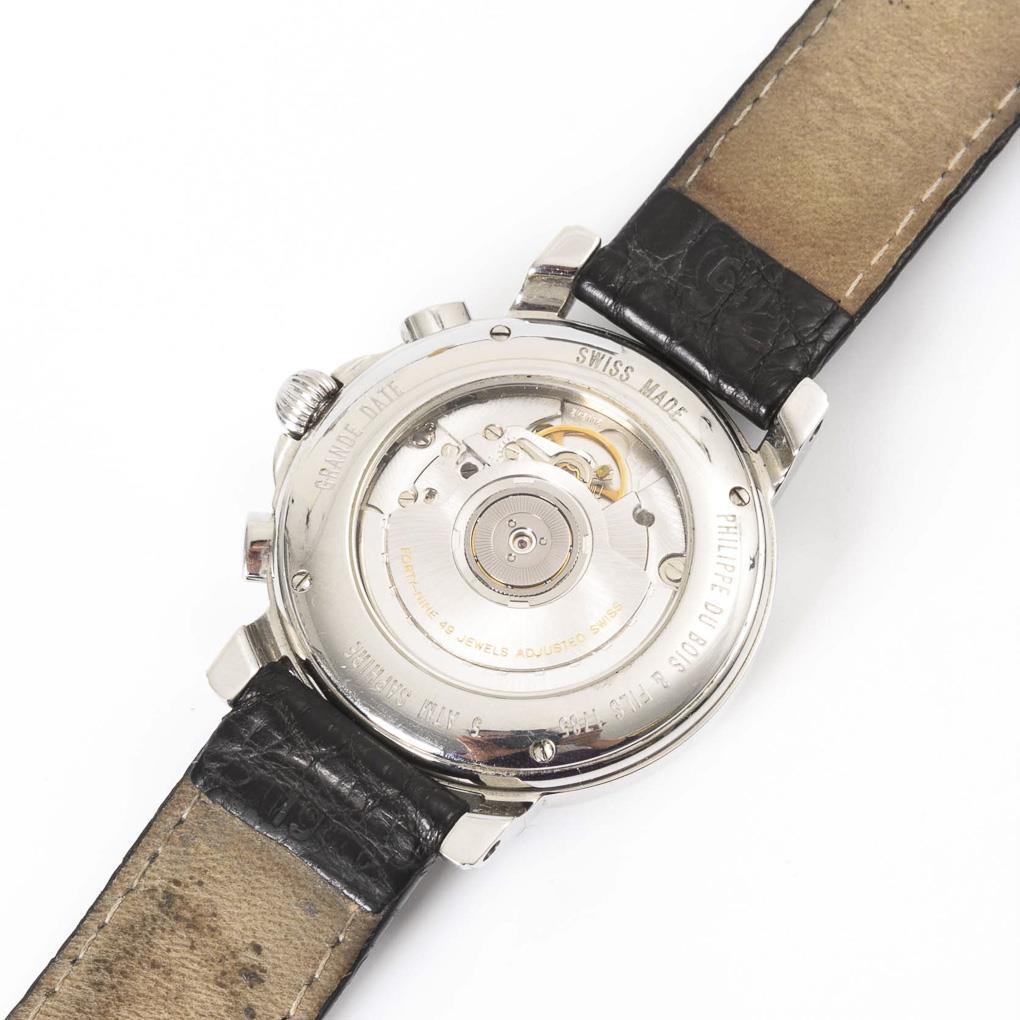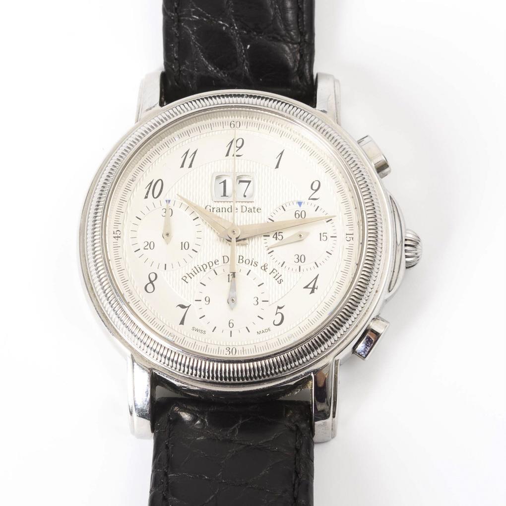 Automatikwerk mit Stellkrone, Drücker für Stoppfunktion. Läuft an. Silberfarbenes Strukturzifferblatt mit arabischen Zahlen, Minutenkranz, Hilfszifferblätter für kleine Sekunde, 30-Minuten und 12-Stunden, Datum mit Schnellschaltung, Dauphin-Zeiger. ManufacturyMarkDial: Grande Date, Philippe du Bois & Fils.
