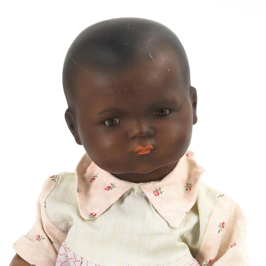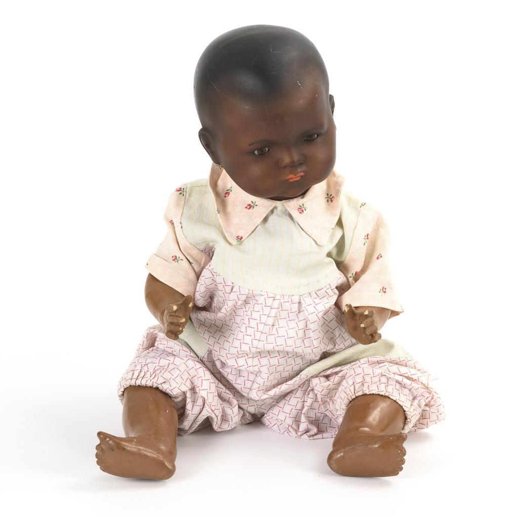 Dunkelbraun getönter Kurbelkopf, braune Schlafaugen, schwarzer Haarboden. 5-teiliger Stitzbabykörper. Heller Spielanzug. 1 Augenlid berieben, Finger etwas bestoßen.
