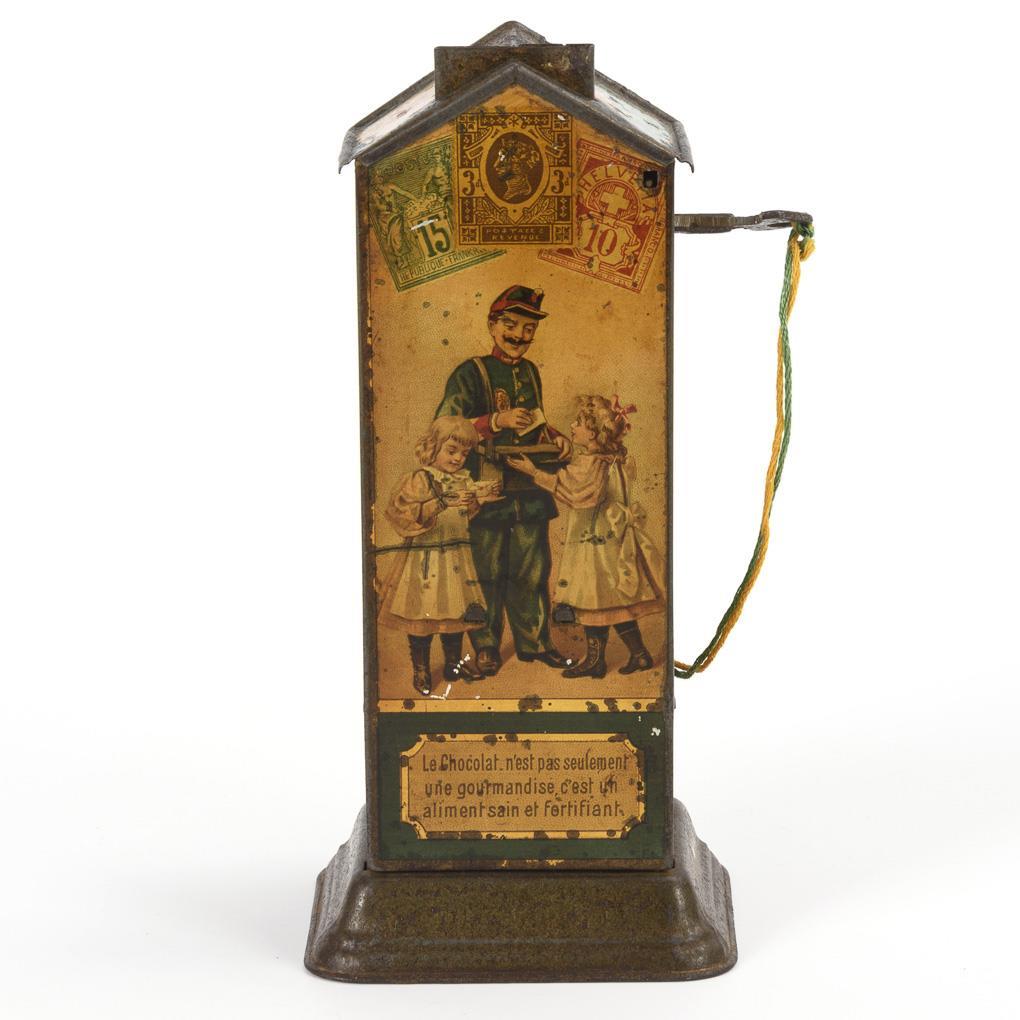 Hochrechteckiger Schokoladen-Sparautomat/-Briefkasten mit Münz- und Tafelschacht, Glasfront und Spendebügel. Allseitig verziert mit Kinderpaaren verschiedener Nationalitäten und Postmotiven. Dazu 1 Heft "Stollwerck's Preis-Liste Weihnachten 1901", Reprint 2003 (19 x 12 cm, 96 Seiten), dort auf S. 96 auch eine Abbildung des Automaten mit Beschriftung in deutscher Sprache. Teils korrodiert.