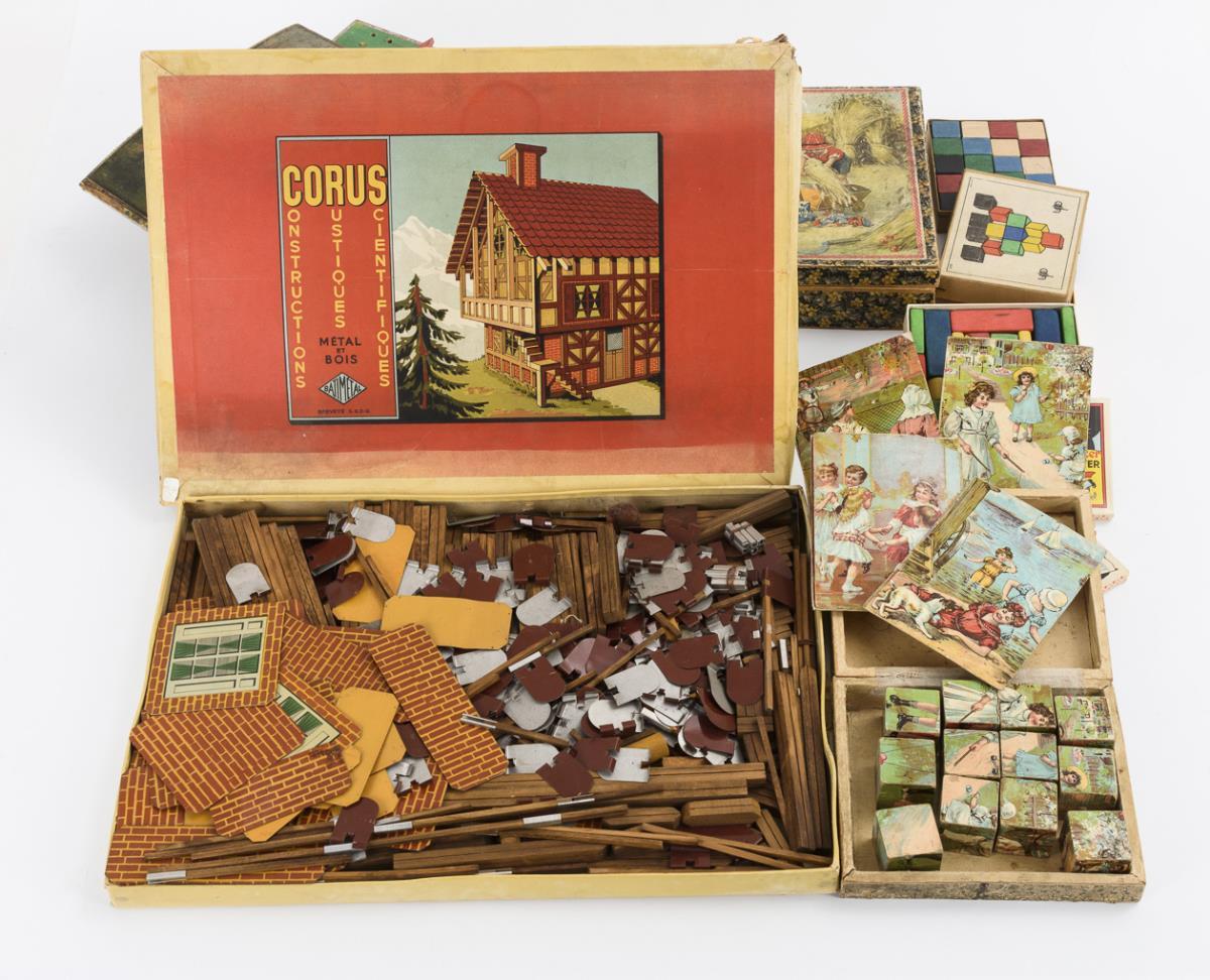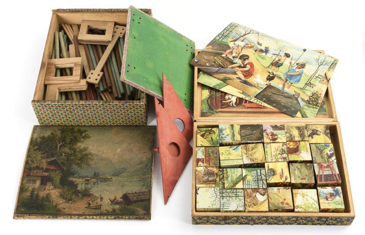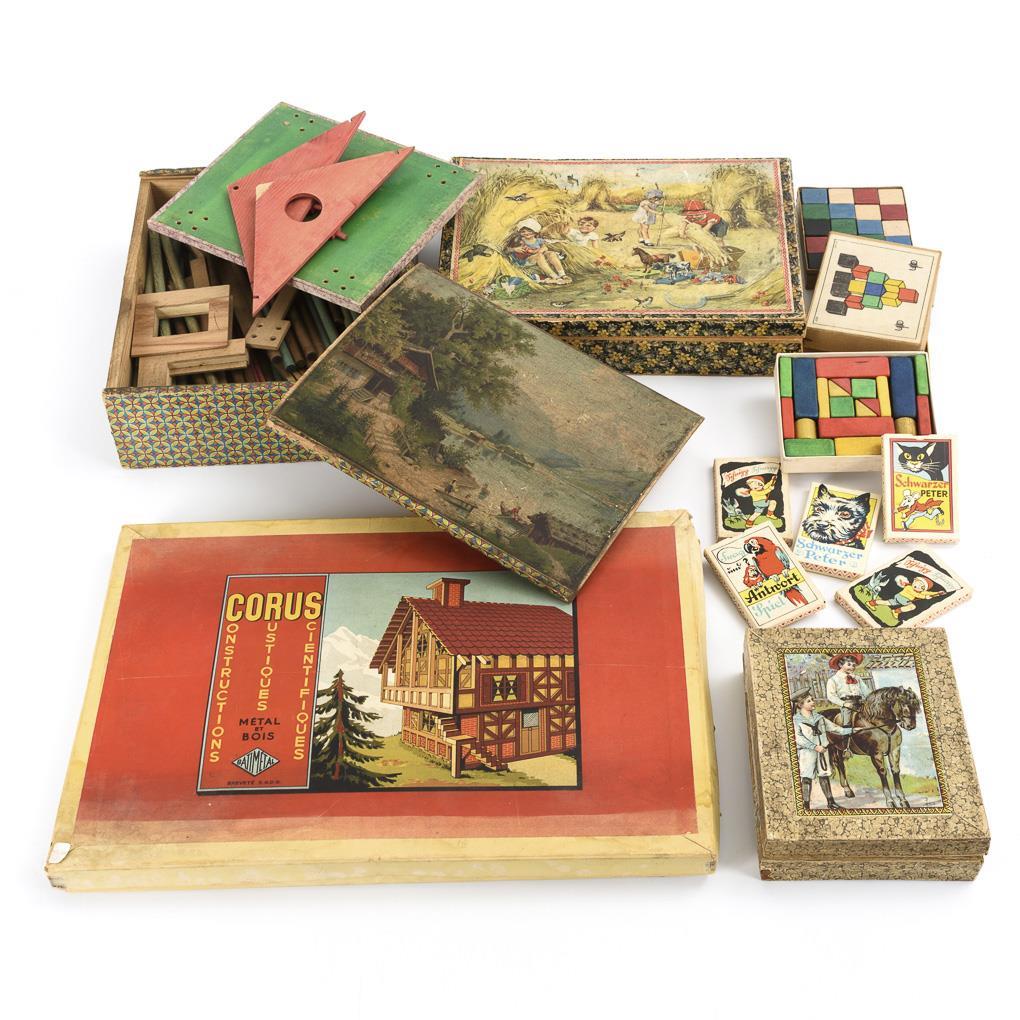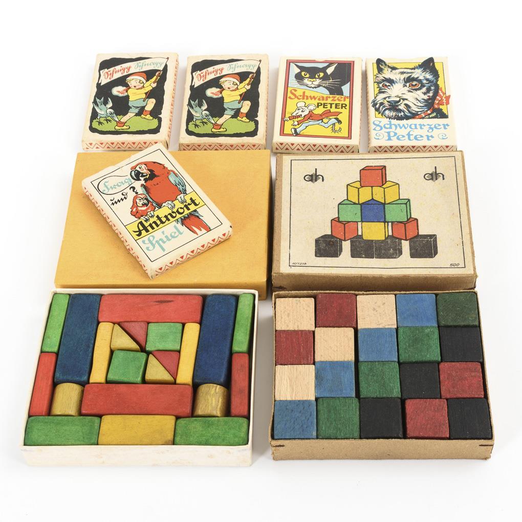 5 Kartenspiele (Schnipp-Schnapp, Schwarzer Peter, Frag-und-Antwort-Spiel), 2 Legespiele, 1 französisches Hausbauspiel ( Fa. Batimétal), 1 Holzklötzchenspiel und 1 kleiner Holzbaukasten. Dazu 1 Schachtel mit dekorativem Farblithographie-Deckel (in der Schachtel überwiegend verschiedene Holzstäbe). Alters- und Gebrauchsspuren.