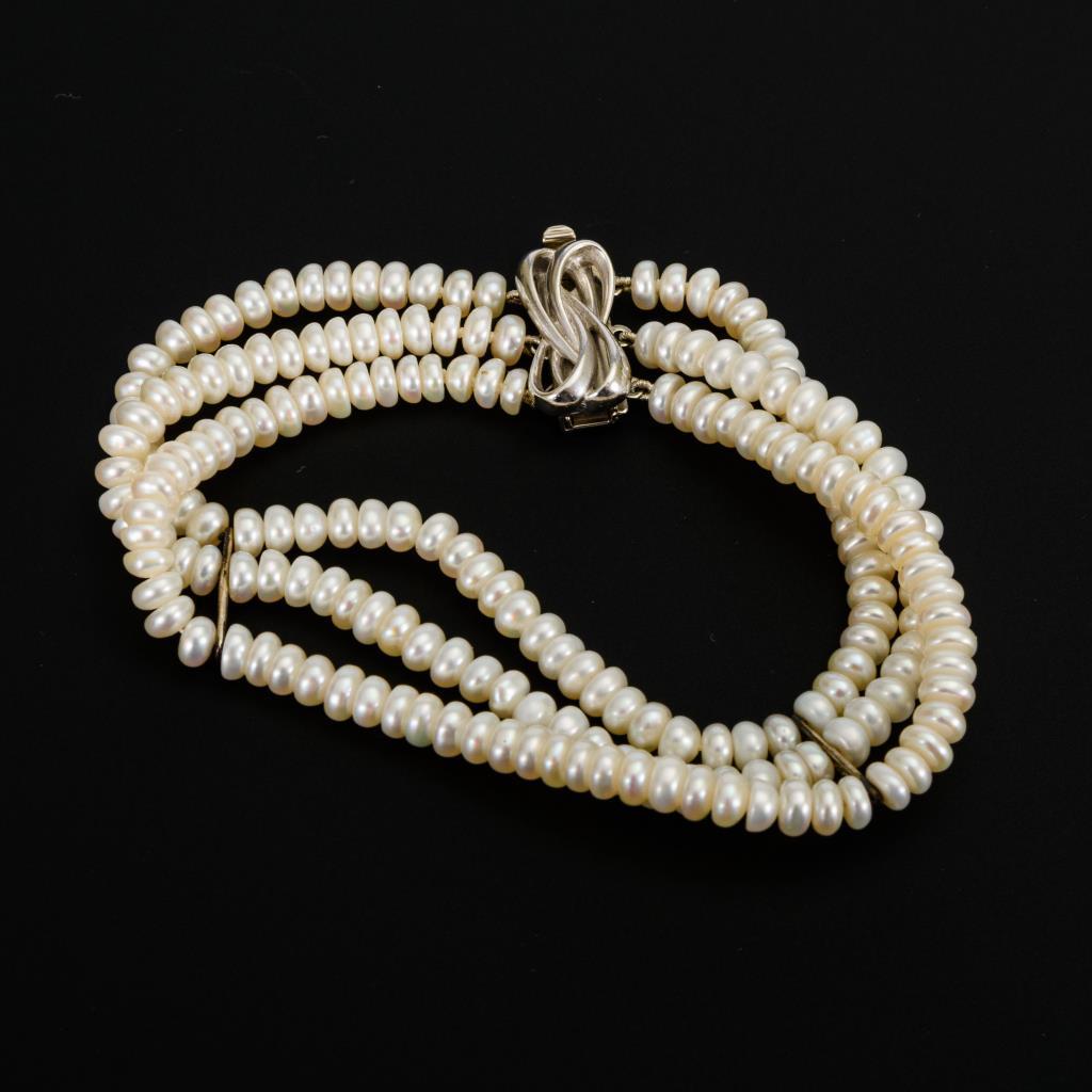 Schnürketten mit cremefarbenen Boutonperlen, an Zierschließe .