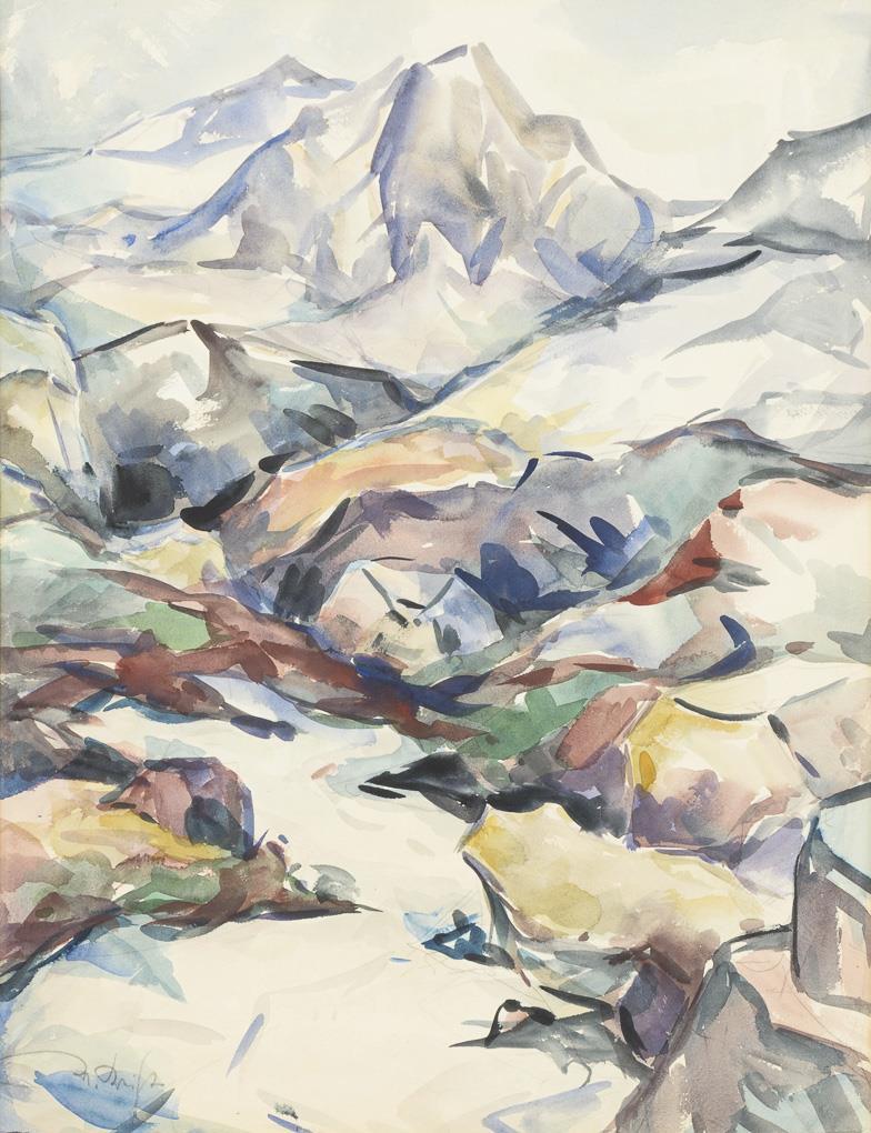 Expressiv gemaltes Gebirge in ausgewählter Farbpalette.