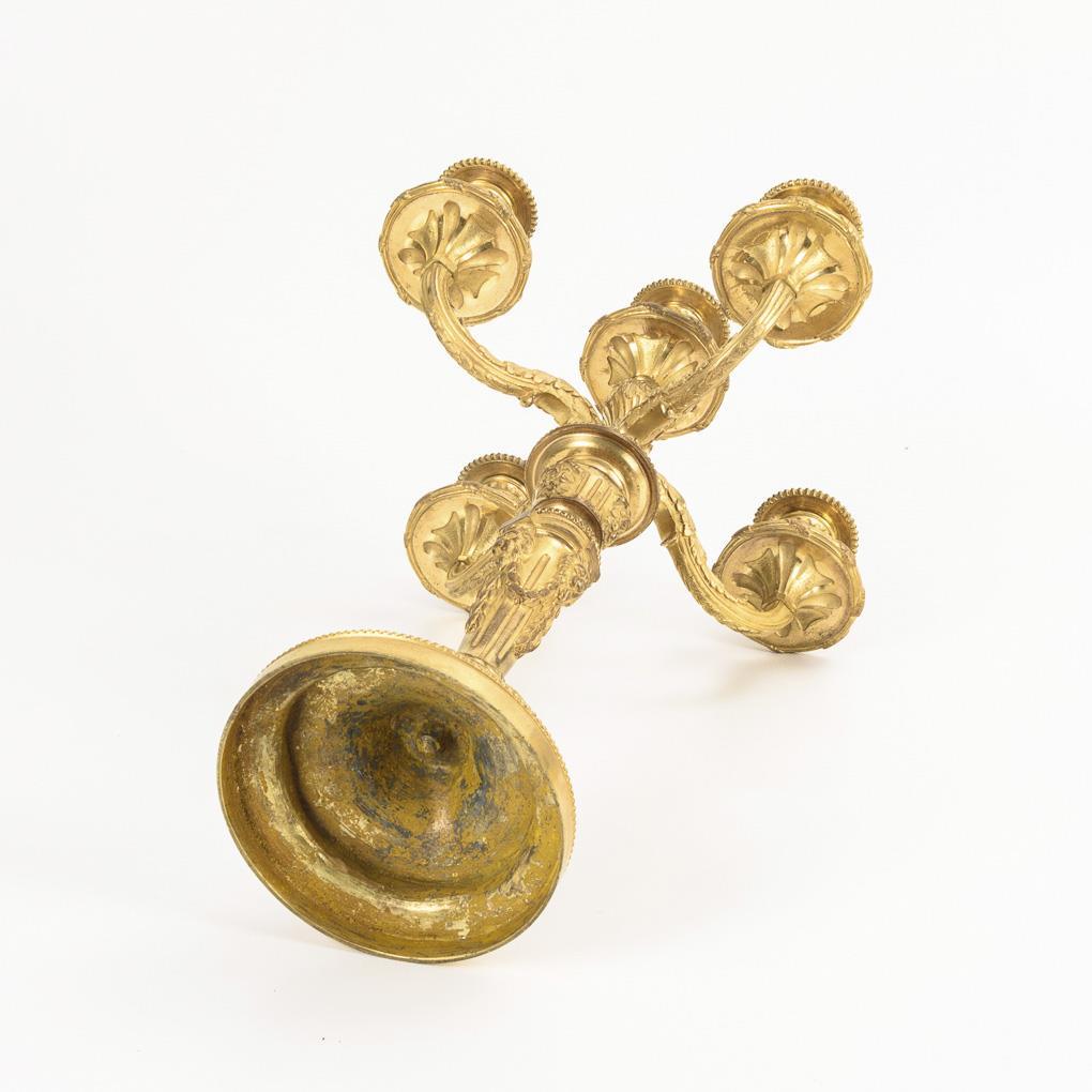 Kerzenleuchter im Louis-Seize-Stil mit reicher Reliefzier, darunter Löwenköpfe mit Girlanden am Schaft. 4 blattbesetzte Volutenarme mit Vasentüllen sowie erhöhte Zentraltülle. Vergoldung berieben.
