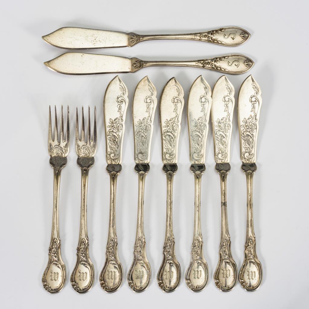 2 Gabeln und 6 Messer mit asymmetrischer Form, Floralgravuren und Monogramm "W". 2 versilberte Messer mit spitz zulaufendem Griffende, floraler Reliefzier und Monogramm "S". Gebrauchsspuren.