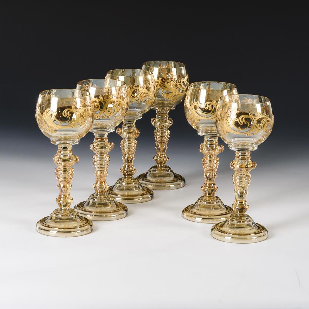 6 Römer mit Reliefgolddekor. Fritz Heckert.