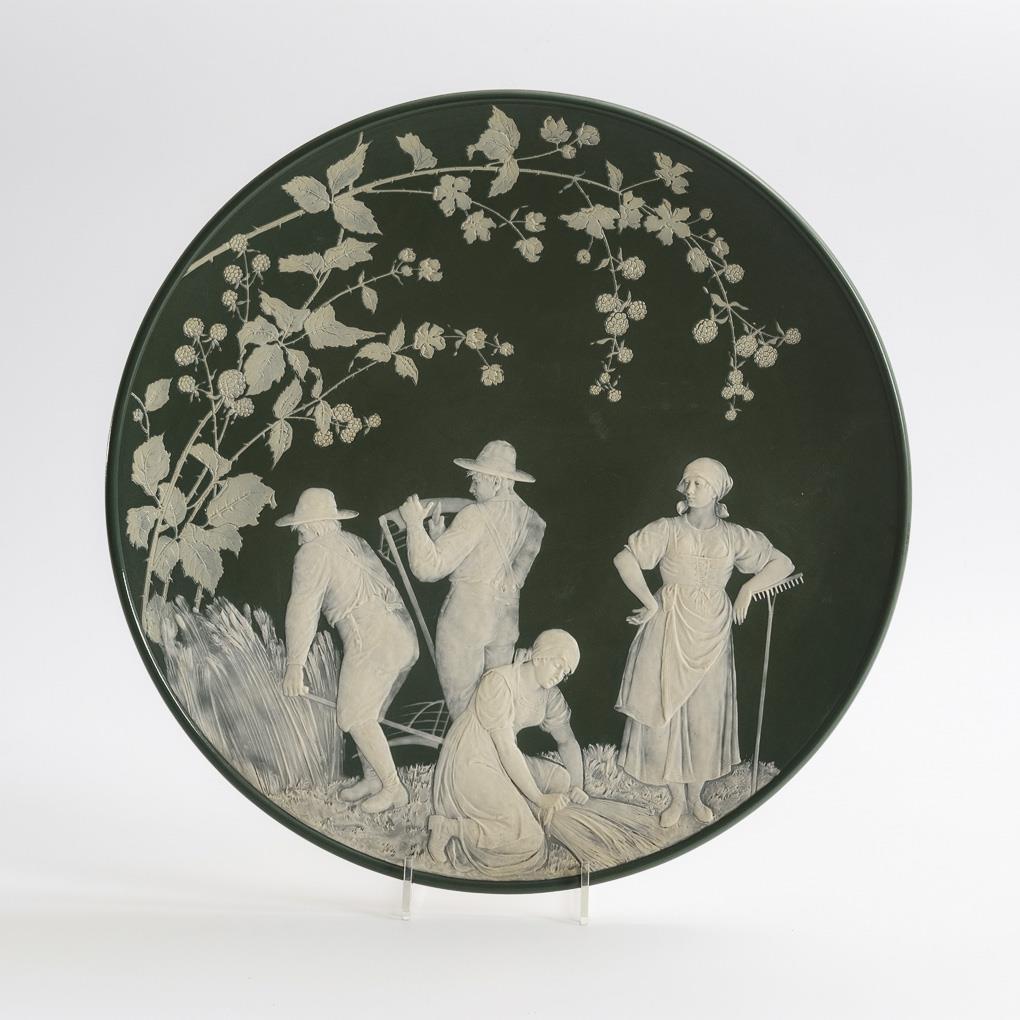 Großer Phanolith-Wandteller mit Bauern bei der Ernte. Villeroy & Boch, Mettlach.