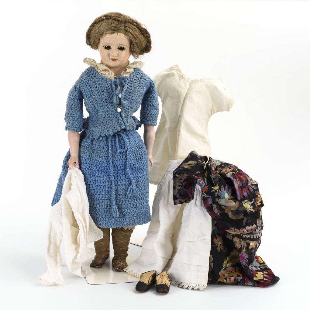 Brustkopf, feste braune Glasaugen, blonde Echthaarperücke mit Flechtfrisur. Schlanker Lederkörper mit Porzellanunterarmen. Blaues Häkelkleid, alte karierte Strümpfe. Dazu 4 Teile Kleidung und 1 Paar Schuhe. Kopf mit mehreren kleinen Rissen. Alter Körper eventuell ergänzt, mit Reparaturstellen (rieselt etwas).