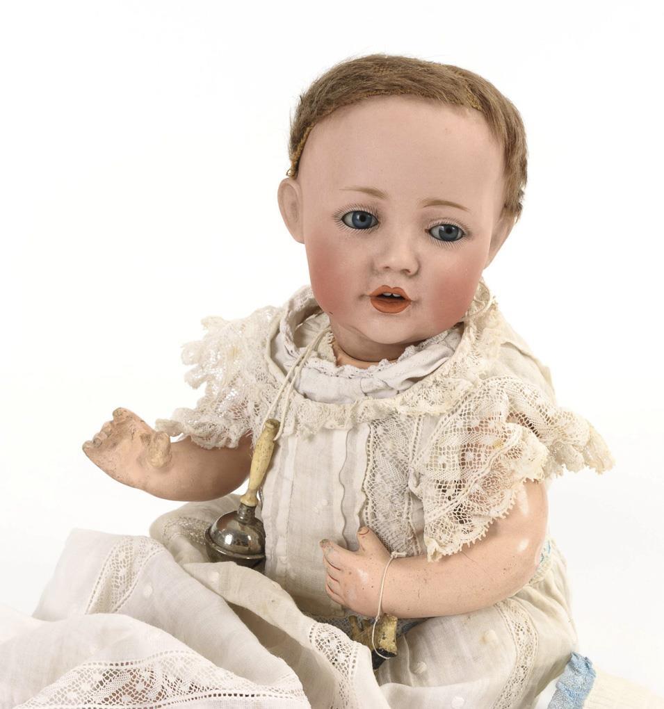 Kurbelkopf, blaue Schlafaugen, Mohairfellperücke mit Altersspuren. 5-teiliger Sitzbabykörper. Weißes Kleid und Haube, anbei Rassel und Reifentier. Kopfdeckel fest vergipst: nicht durchleuchtet, doch ohne sichtbare Defekte. Lider minimal berieben, Finger minimal bestoßen.