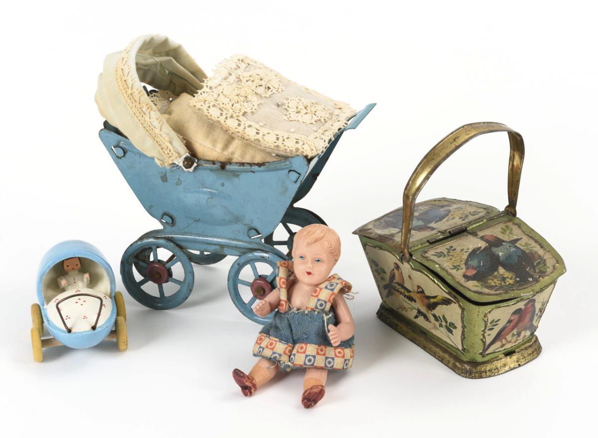 Aus Blech: Puppenwagen mit Celluloidpüppchen und Picknickkorb mit Vogellithographien. / Aus Holz (Erzgebirge): Kinderwagen, Schaukel und Kinderstuhl mit Miniaturpüppchen aus Porzellan. Teils Altersspuren.