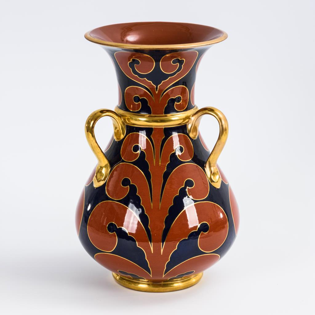 Dreihenkelvase mit trichterförmig ausgestellter Mündung und Rollblattdekor. Trichterhals außen und 1 Henkel restauriert, partiell leicht goldberieben.