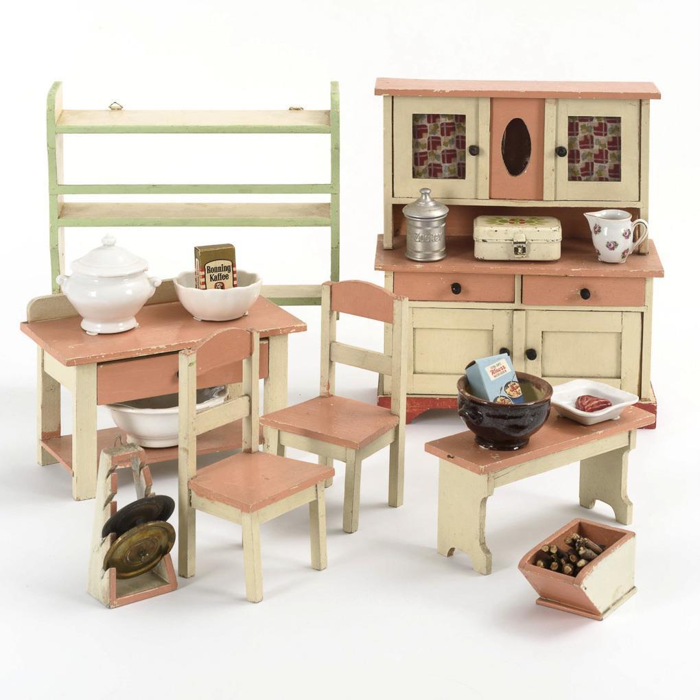 Küchenbuffet, Waschtisch, 2 Stühle, Wandbord, Bank, Stürzenhalter und Kohlenkasten. Dazu Brotdose, 2 Stürzen, 1 Kasserolle, 4 Schüsseln, 1 Terrine, 1 Krug, 1 Dose sowie 1 Fleischstück und eine Haferflockenschachtel. Gebrauchsspuren.