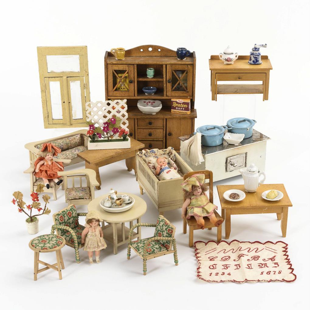 Küchenbuffet, Waschtisch, Tisch, Bank, Blechherd mit 2 Kochstellen, Stuhl, Kinderbett, 2 Sitzgruppen für den Garten (Bank, 2 Stühle, Tisch sowie Tisch und 2 Stühle mit Stoffbezug), Blumenspalier, 1 Blumentopf und 1 Fenster. Dazu vier Pappschachteln, 2 Emailtöpfe, 18 Teile Porzellan/Keramik, 2 Schauspeisen, 1 Blumenspalier, 1 Blumentopf, 1 Stickmustertuch und 1 Fenster sowie 4 Celluloidpüppchen. Alters- und Gebrauchsspuren.