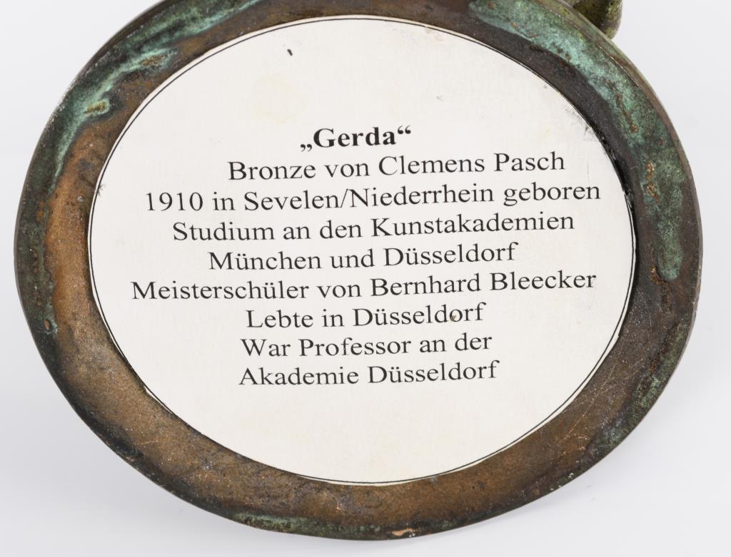Bronze braun und teils grün patiniert.Unter der Plinthe Klebezettel mit Künstlerangaben und Titel.H 18 cm.