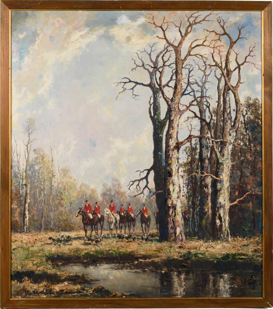 Die Reiter in rot-weißer Kleidung am Waldrand mit den Hunden.