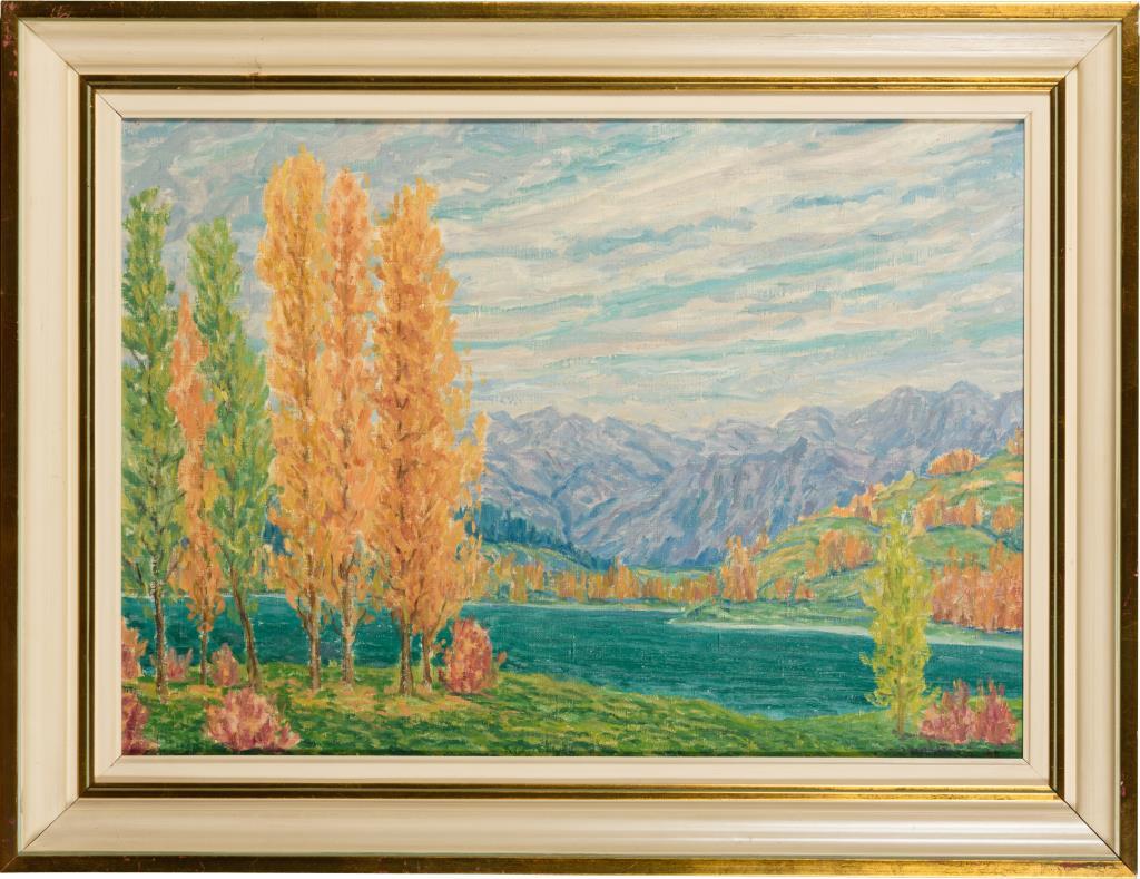 Der oberitalienische See in impressionistischer Manier, umgeben von herbstlichen Bäumen.
