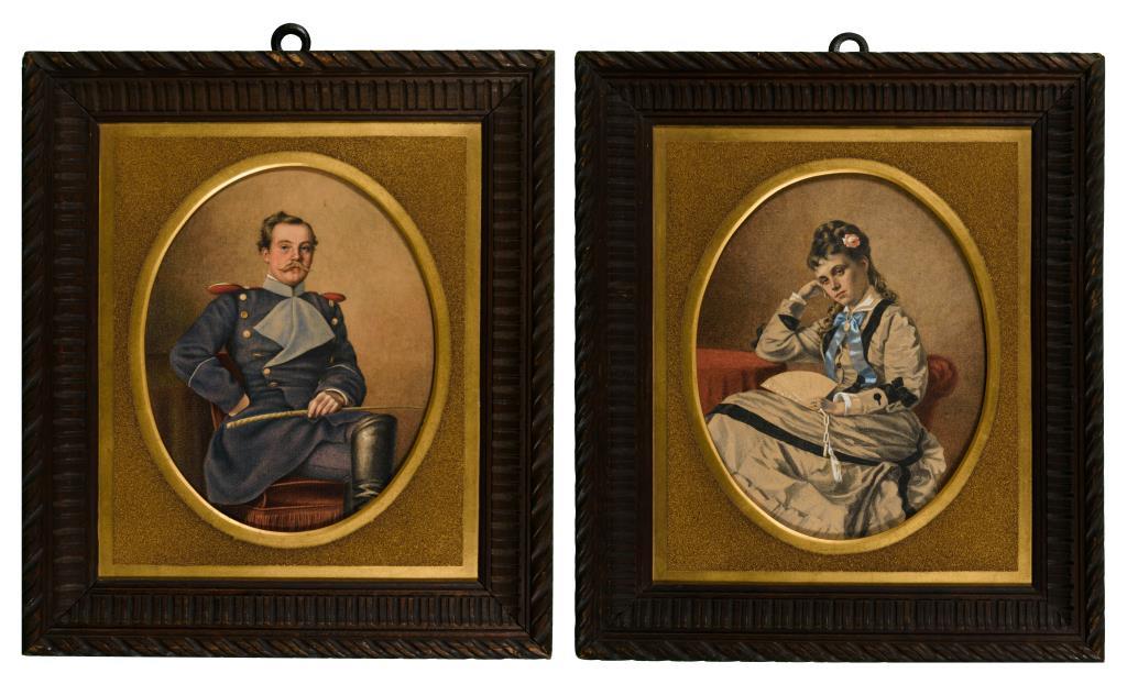 Zwei Porträts eines Paares in Uniform und hellem Kleid. Minimal verschmutzt.
