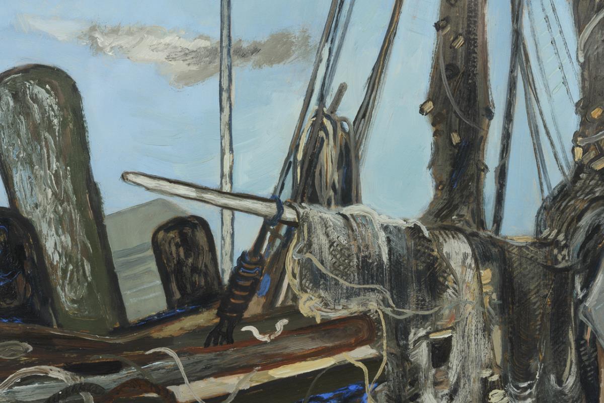 Blick auf die Takelage eines Fischerbootes vor blauem Himmel.