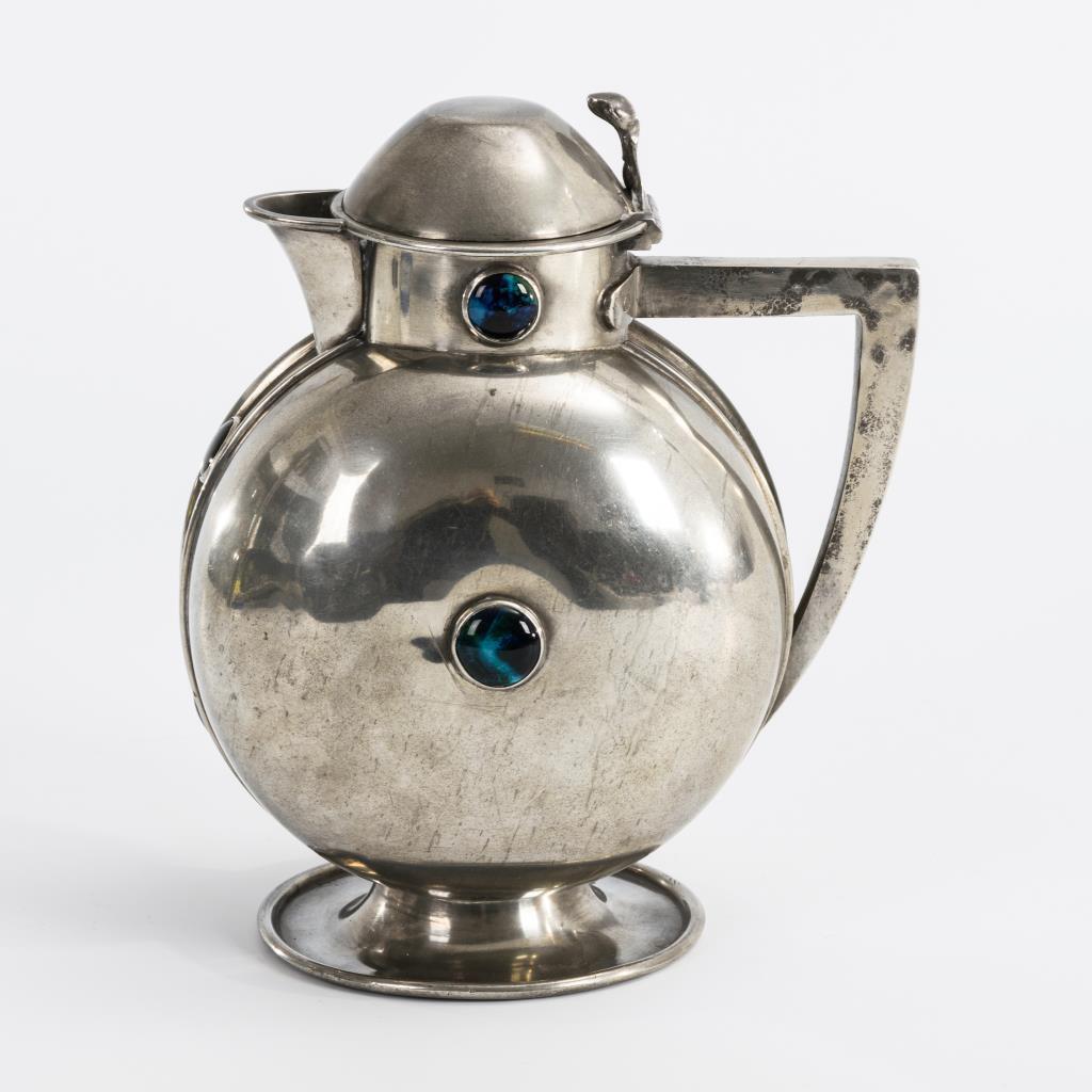 Entwurf wohl Archibald Knox. Kugelförmige Kanne mit Cabochons wohl aus farbigem Email und Winkelhenkel; eventuell Werksentwurf. Wenige Alters-/Gebrauchsspuren.