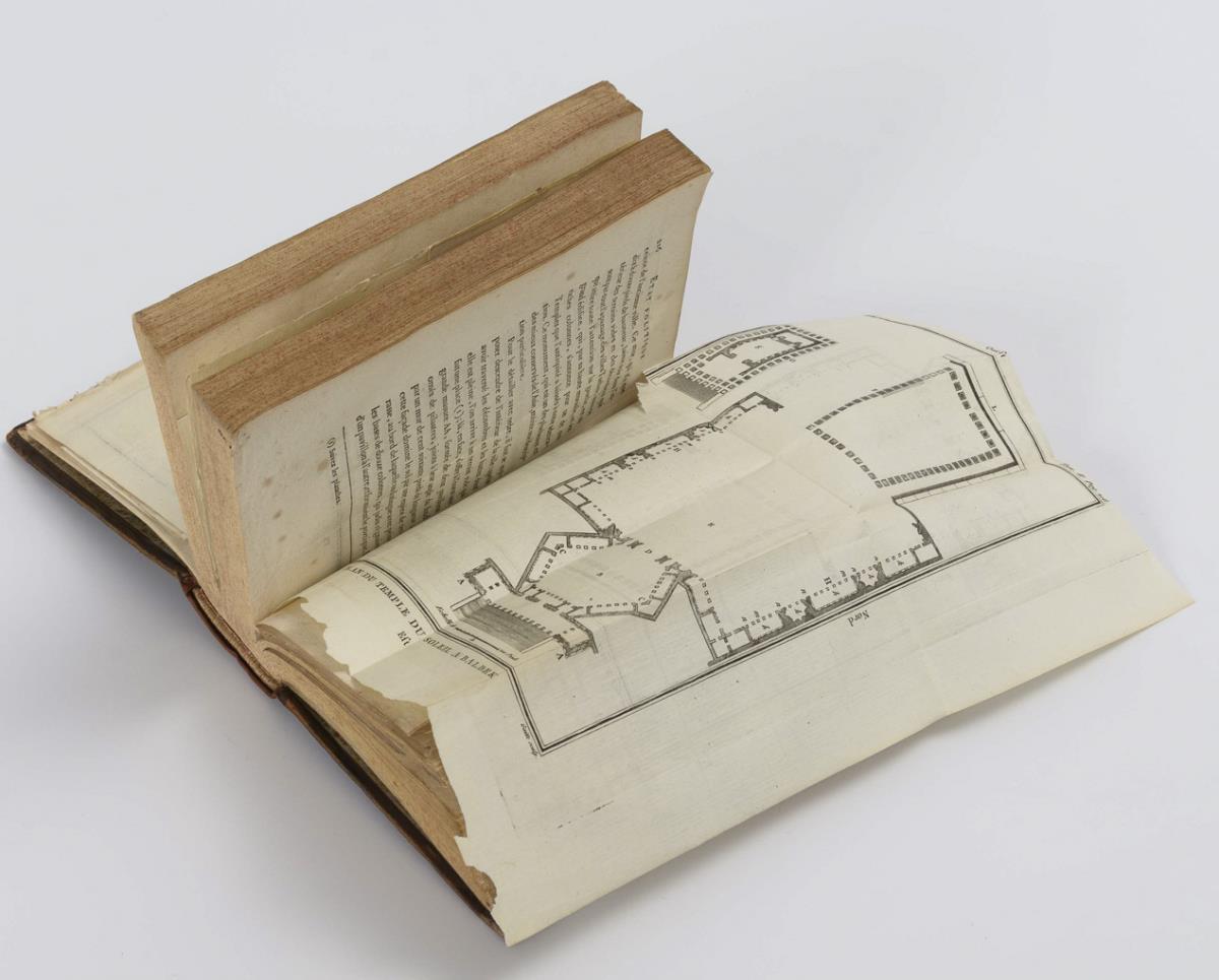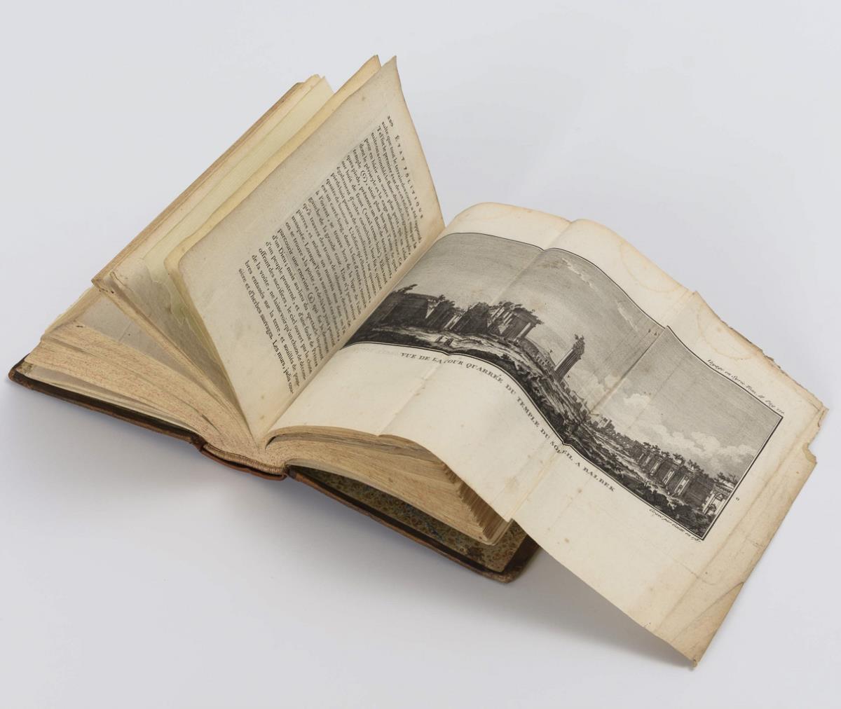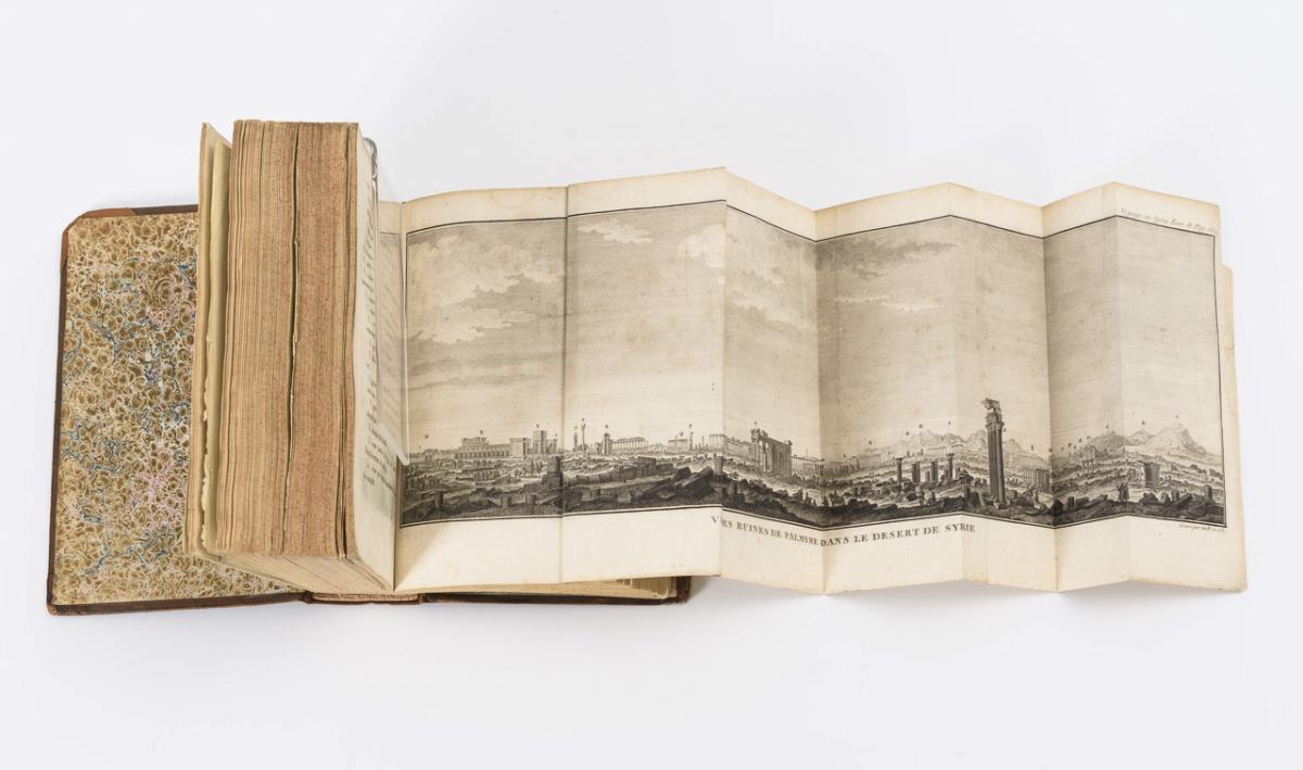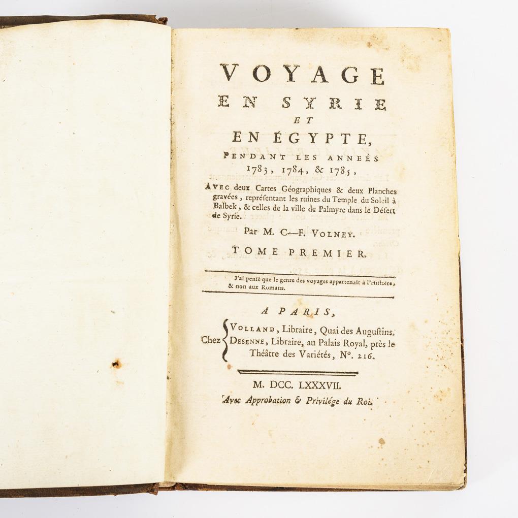 Zwei Teile in einem Band, 14, 383, 8, 458, (4) Seiten. 2 Landkarten und 3 Tafeln zu Balbek und Palmyra. In französischer Sprache. Ledereinband jünger nachgebunden unter Verwendung alter Teile, Gebrauchsspuren, Block fest, Tafeln etwas geknickt.