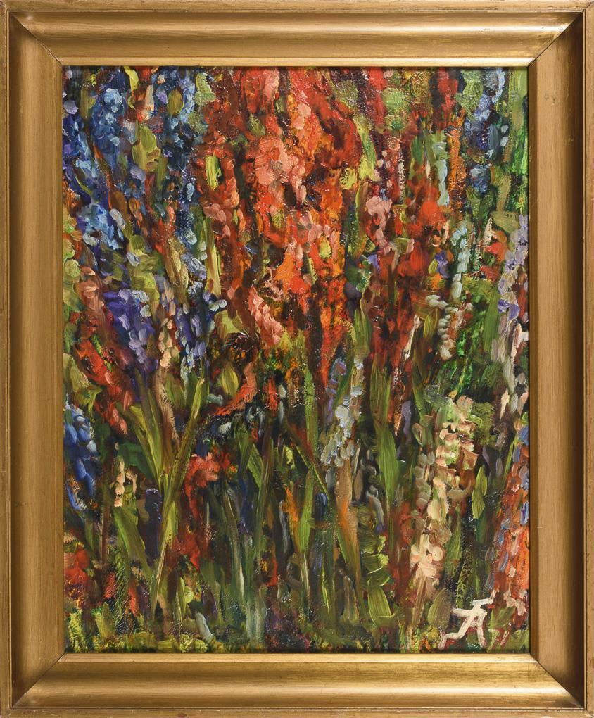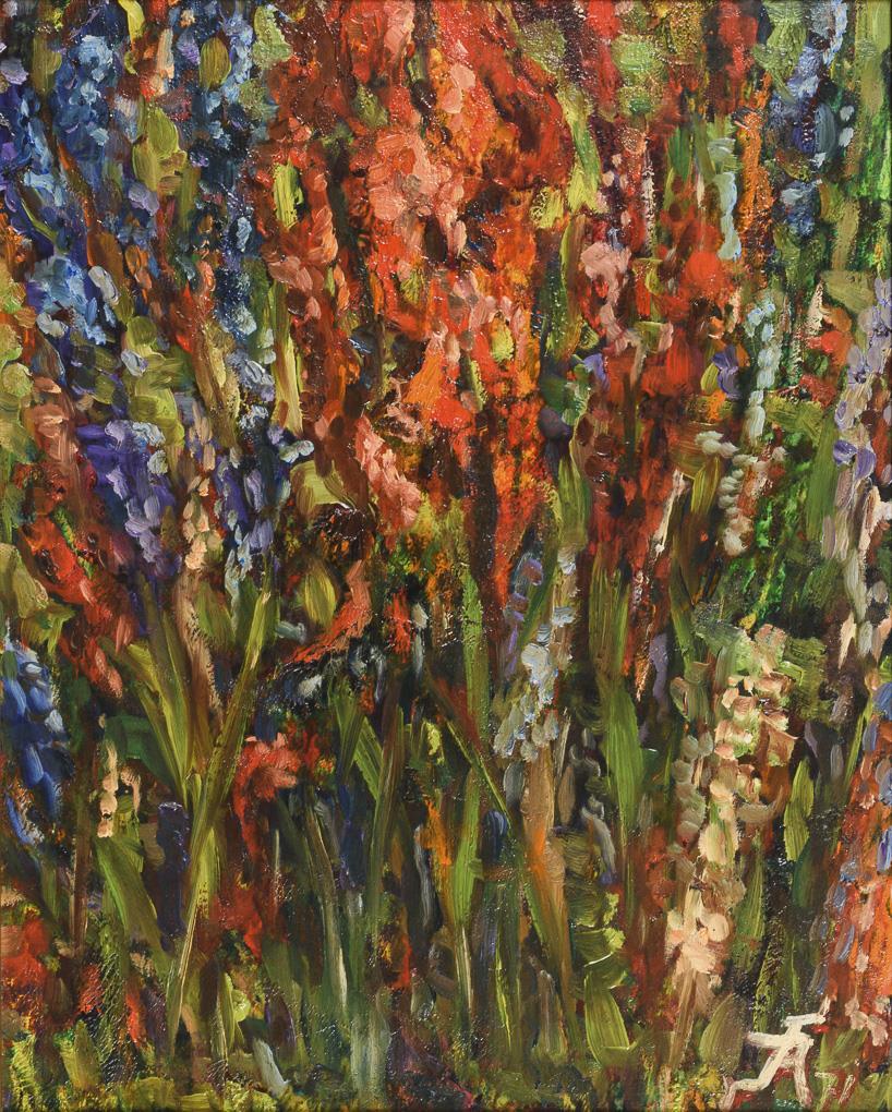 In leuchtenden Farben dargestellte, dicht beieinander stehende Blumen.