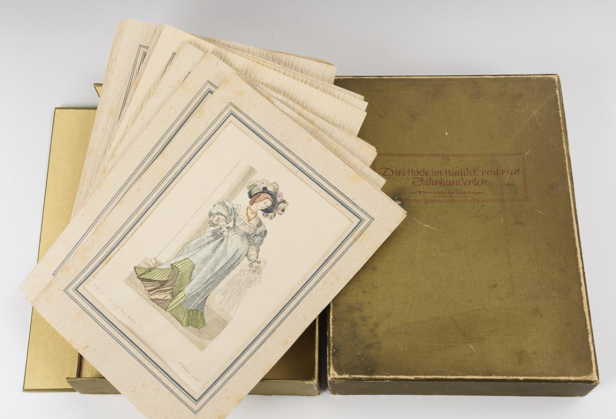 21 von 23 Darstellungen von Damenmode nach Illustrationen verschiedener Modejournale, Blatt: je 28,5 x 22 cm, je im Passepartout, gezeichnet von Jutta Wagner, gestochen von P. Simon. Je minimal stockfleckig, Karton mit Gebrauchsspuren.