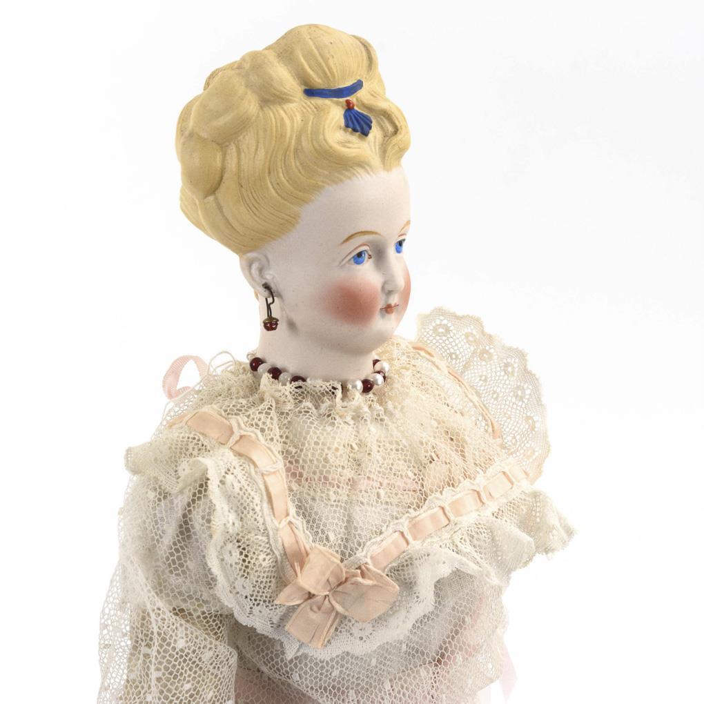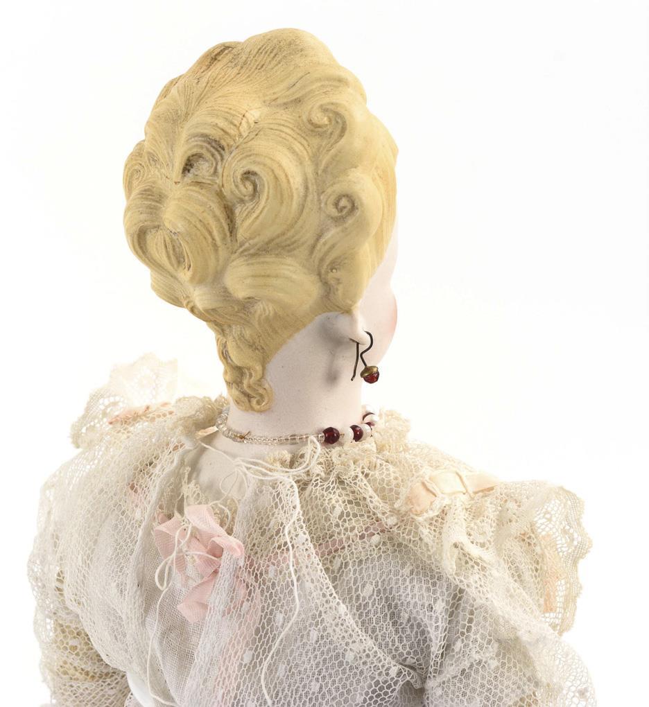 Gemalte blaue Augen, originale Ohrringe, kunstvoll modellierte Modefrisur. Lederkörper mit Biskuitunterarmen. Helles Spitzenkleid, Ringelstrümpfe, rotbraune Lederschuhe. Kopf ohne sichtbare Defekte, Körper mit leichten Altersspuren (rieselt etwas).