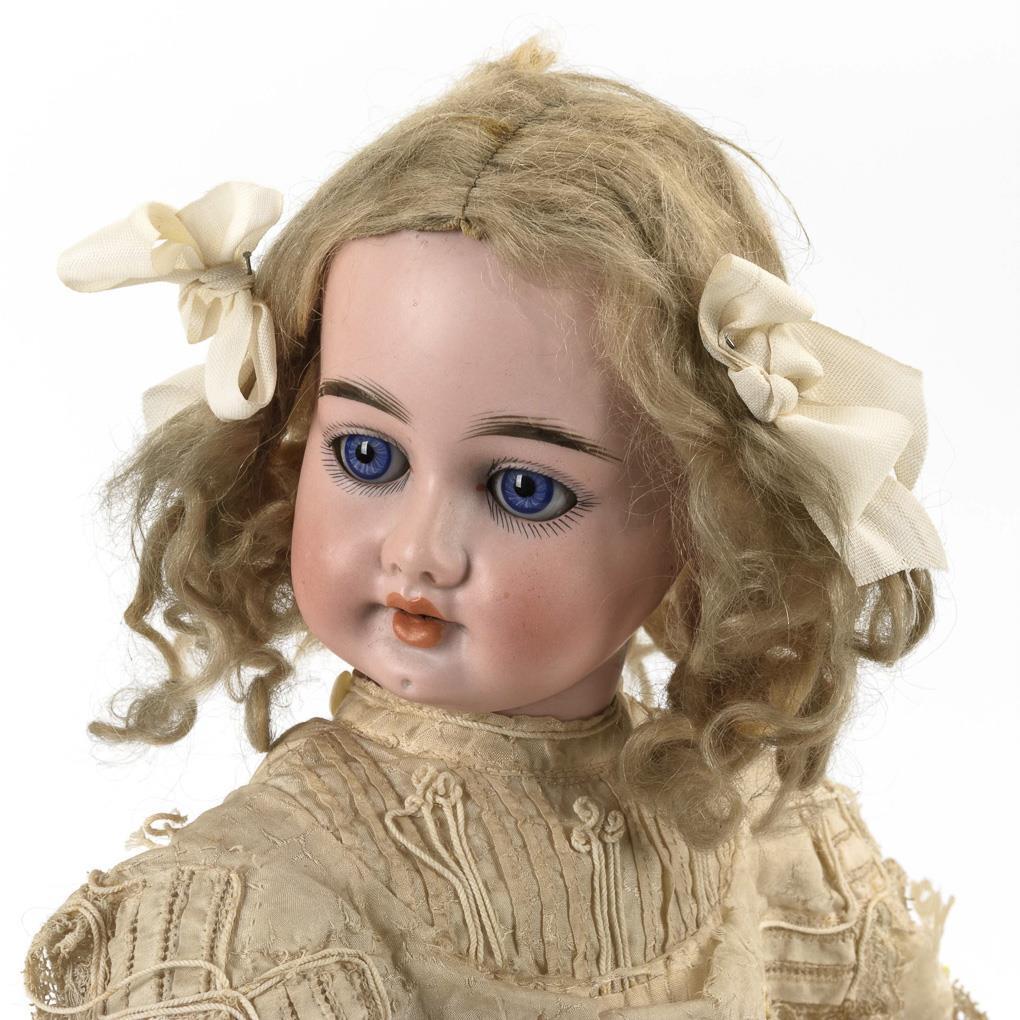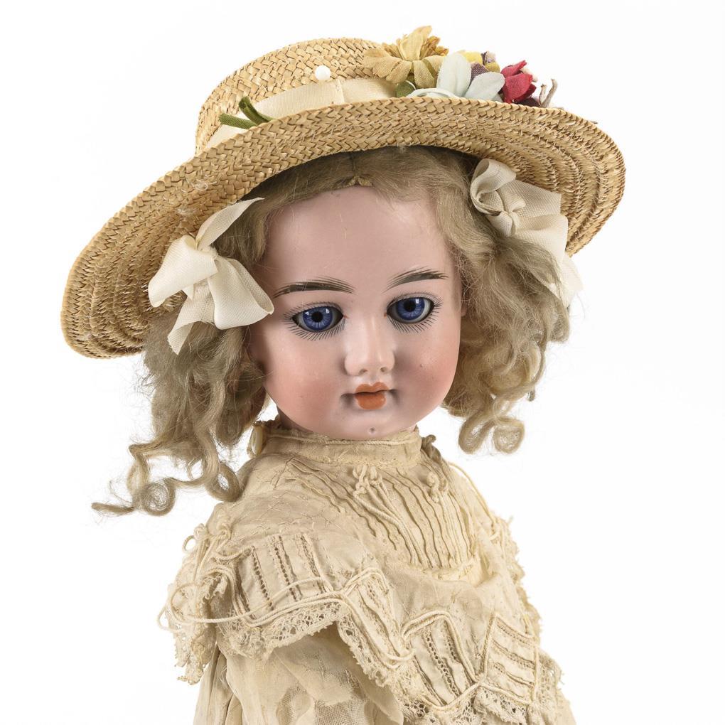 Kurbelkopf, blaue Schlafaugen, festgeklebte blonde Mohairperücke. 11-teiliger Gliederkörper mit rot lackierten Fingernägeln. Helles altes Seidenkleid, weiße Schuhe und Schutenhut aus Stroh. Kopf nicht durchleuchtet: keine Defekte sichtbar. Körper mit kleinen Farbdefekten.