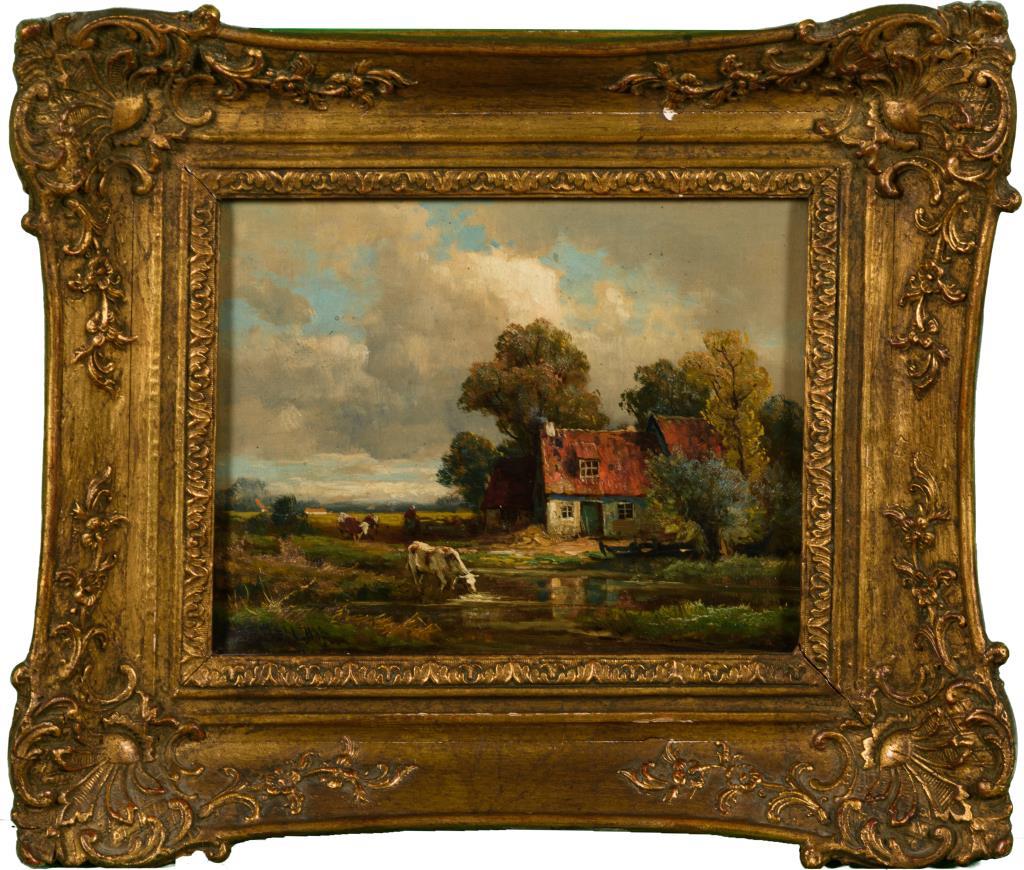Kühe am Weiher nahe dem Bauernhaus in weiter Landschaft.