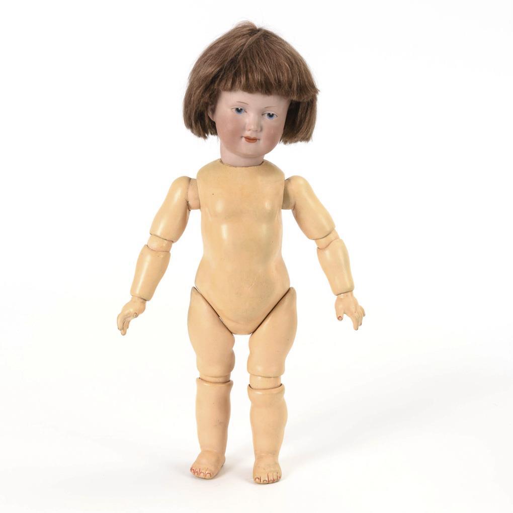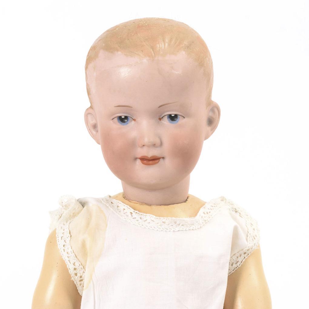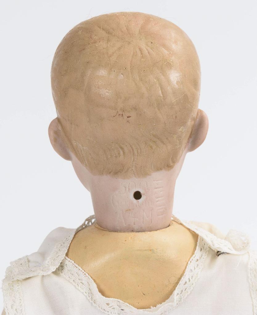 Vollkopf, gemalte blaue Intaglioaugen, modellierte Kurzhaarfrisur unter hellbrauner Mohairperücke. 17-teiliger Toddlerkörper. Altes kariertes Kleid, schwarze Wachstuchschuhe. Keine Defekte sichtbar. Körper übermalt.