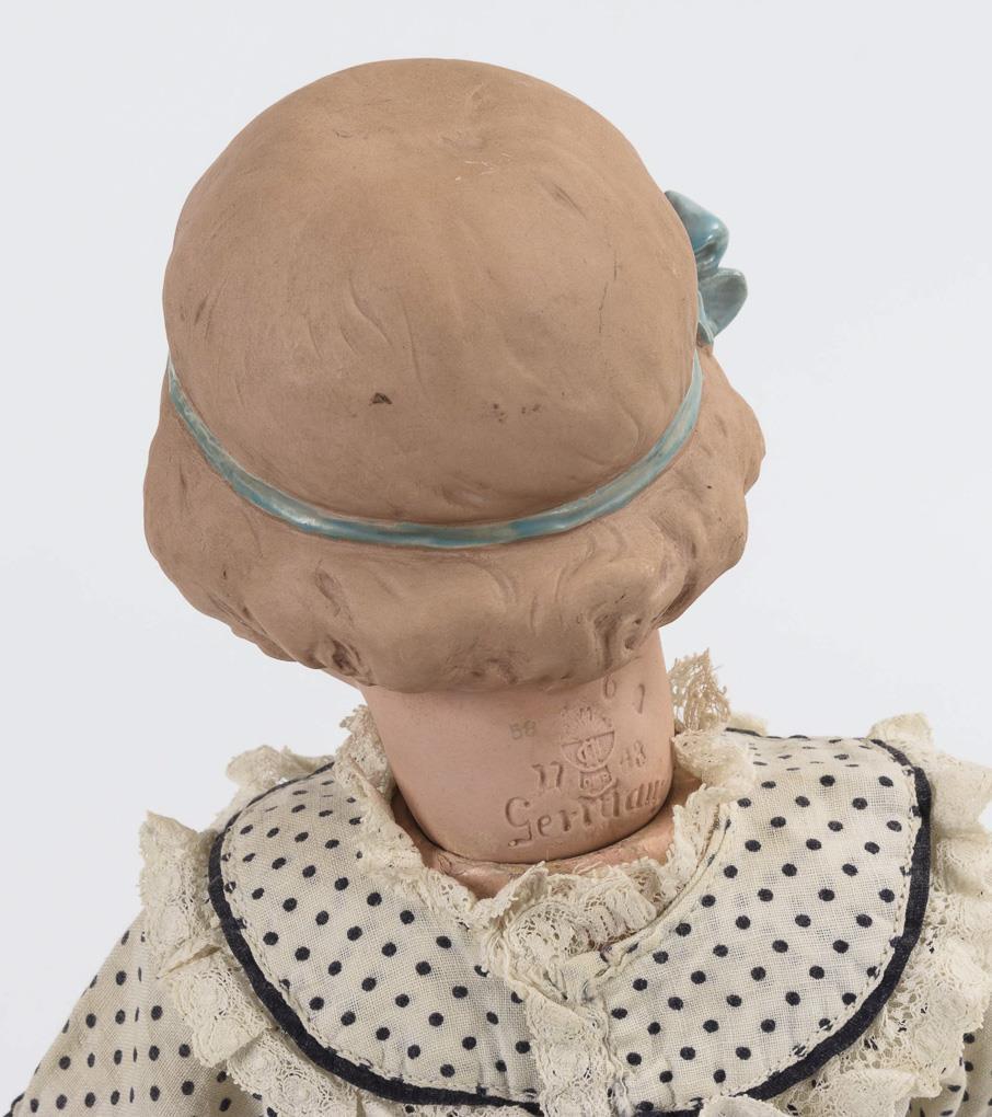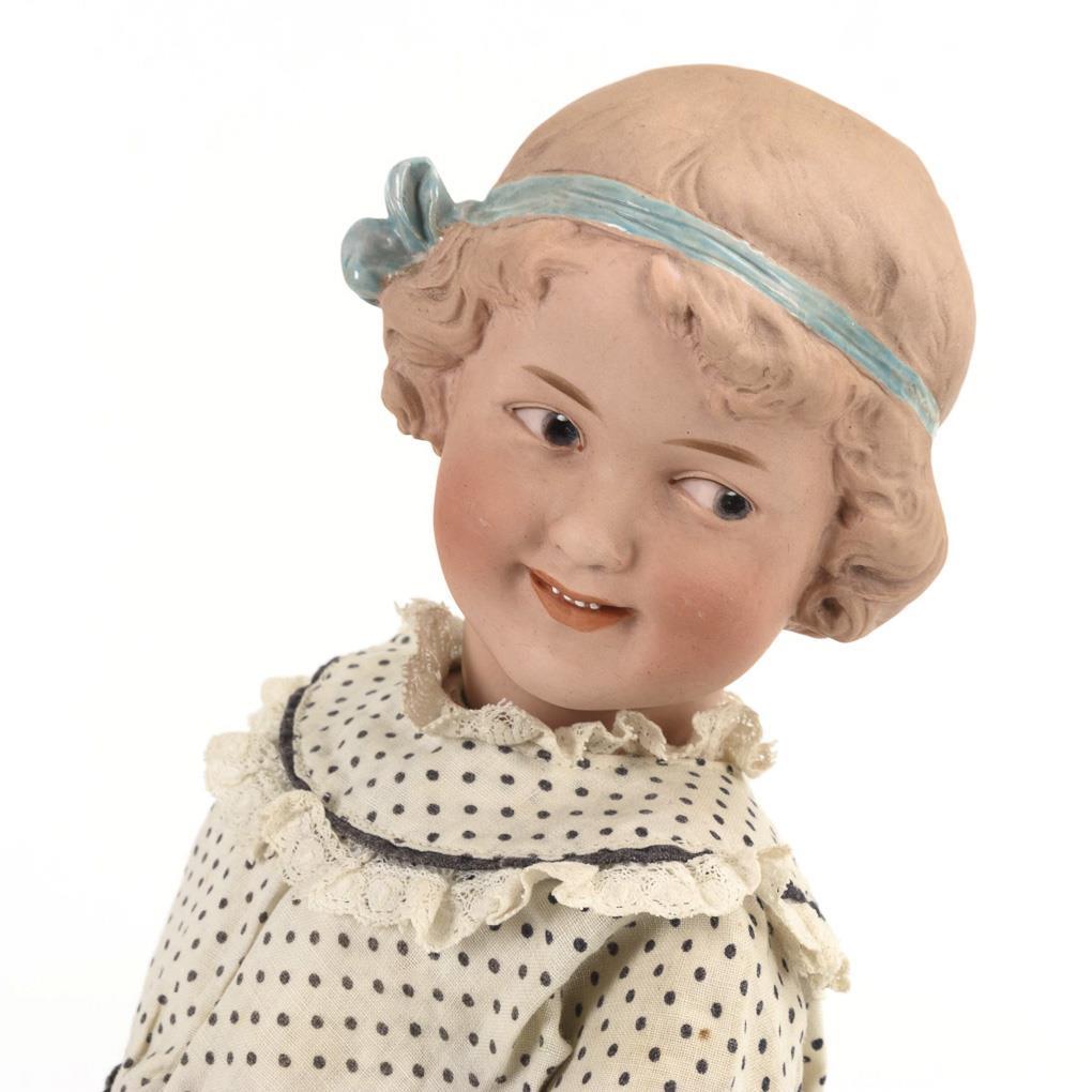 Sehr schön modellierter Kurbelkopf, blaue Intaglio-Augen, lachender Mund mit 4 glasierten Zähnchen, modellierte Haare mit hellblauer Schleife. 15-teiliger Toddlerkörper mit älteren Kugelgelenkarmen. Weißes Kleid mit schwarzen Pünktchen, braune Lederschuhe. Unter dem Kinn kleiner Chip mit Haarriss.