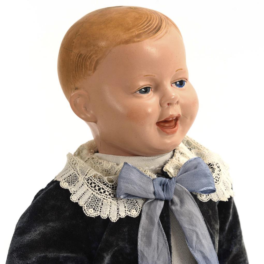 Kleine Puppe mit sehr seltenem Einbindekopf, gemalten blauen Augen, lachendem Mund und gemalten blonden Haaren. Stoffkörper mit Gliederarmen. Blauer Samtanzug nachgenäht, weiße Mütze. Haare partiell retuschiert, 1 Auge übermalt, kleine Risse an Mund, Wange und Haarboden, im Mund winziger Ausbruch.