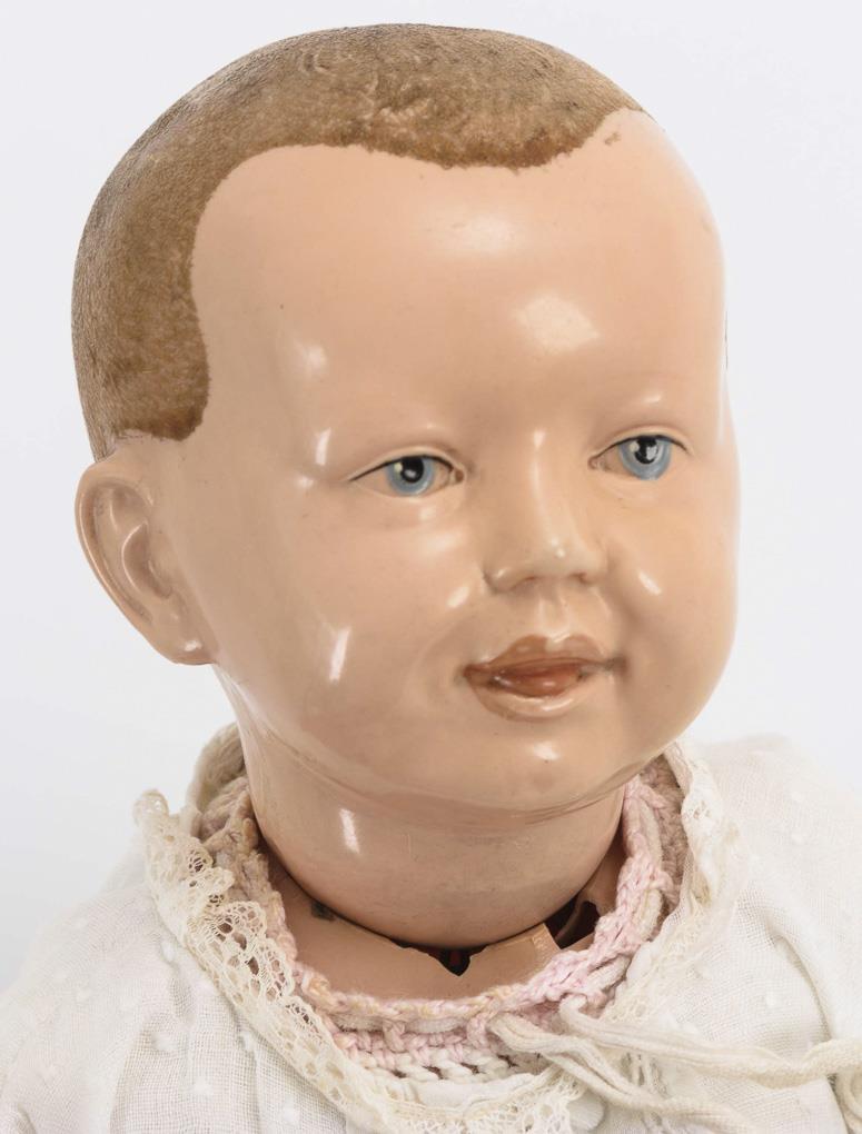 Kurbelkopf, gemalte blaue Augen, offener Mund mit modellierter Zunge, "geflockte" Haare. 5-teiliger Sitzbabykörper mit flachem Po. Weißes Kleid und Häubchen aus Tupfenvoile. Dazu schwarz lackiertes Metallbett mit kariertem Bettzeug (L 40,5 cm). Haarrisse jeweils im Bereich der Ohren und an den Füßen.