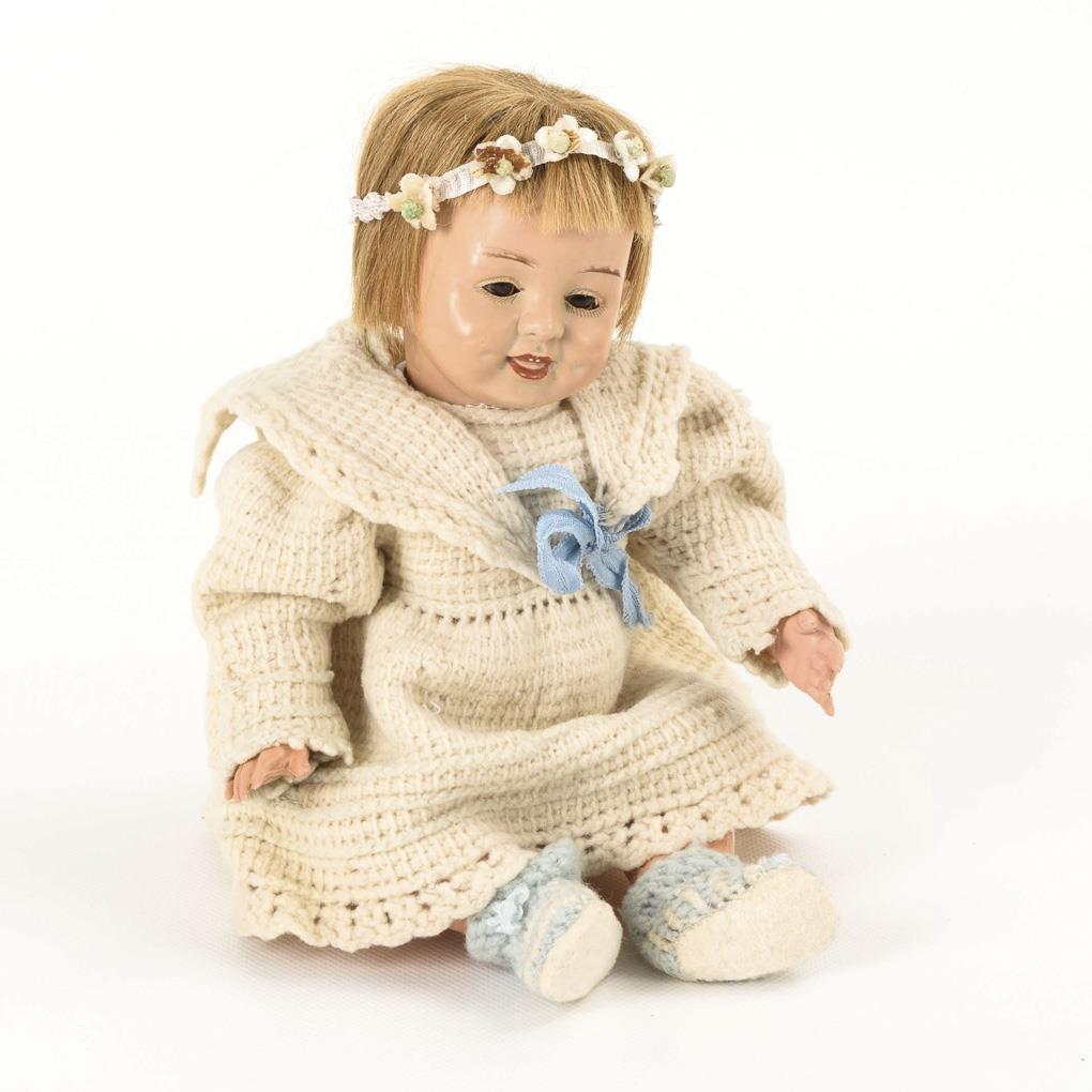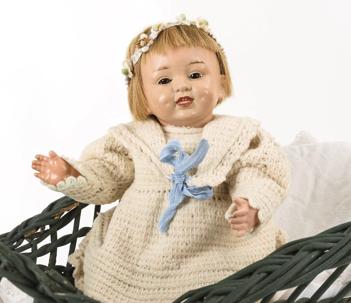 Kurbelkopf, feste braune Glasaugen, modellierte Zunge, blonde Echthaarperücke. Passend ergänzter, 5-teiliger Sitzbabykörper mit flachem Po. Helles Häkelkleid mit Matrosenkragen, Haarkränzchen. Dazu alter, geflochtener Puppenwagen mit 3 Rädern (50 x 61 x 26 cm). Kleiner Riss im rechten Augenwinkel. Rechter Arm mit kurzem Riss, linker Arm heller, Beinscheiben alt repariert.