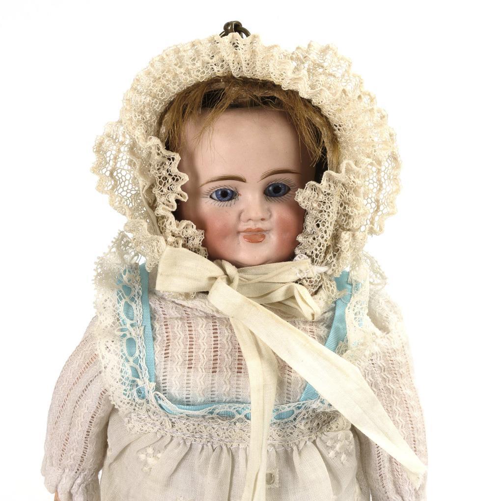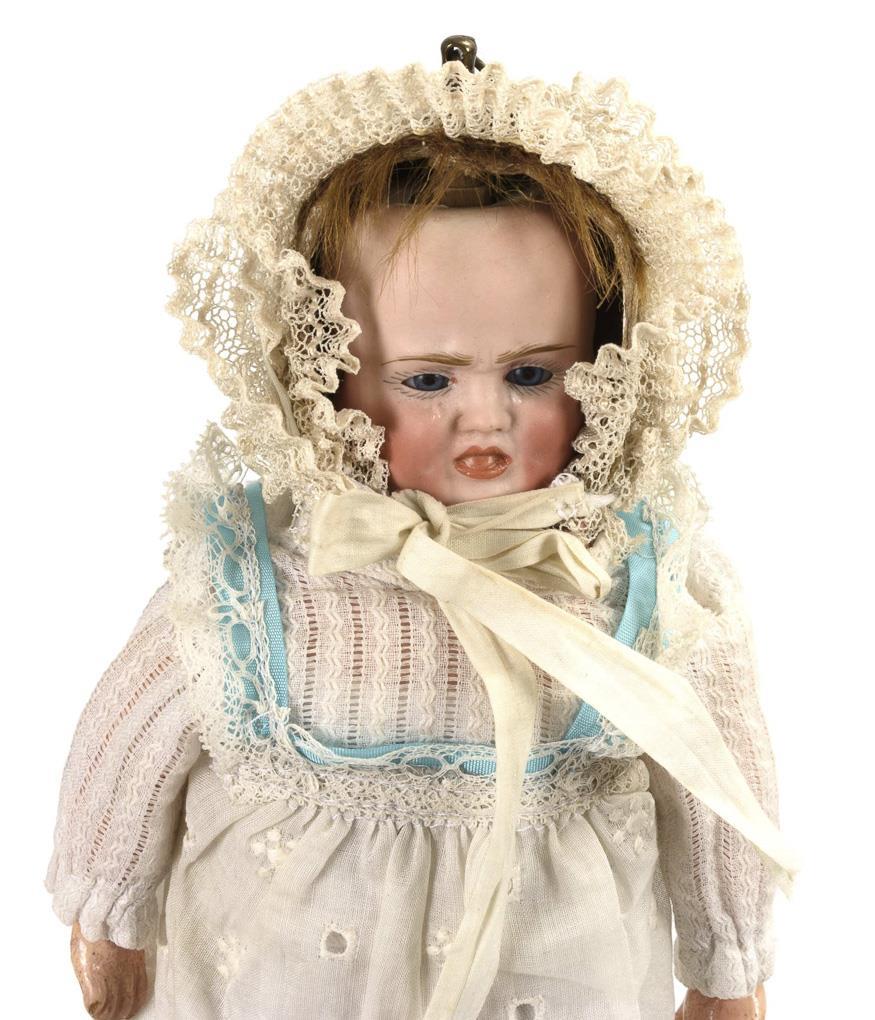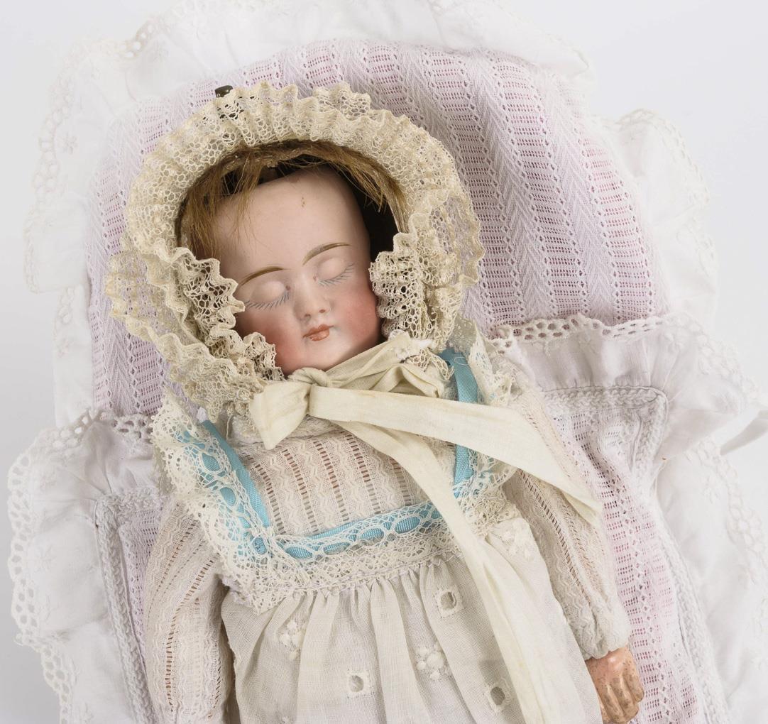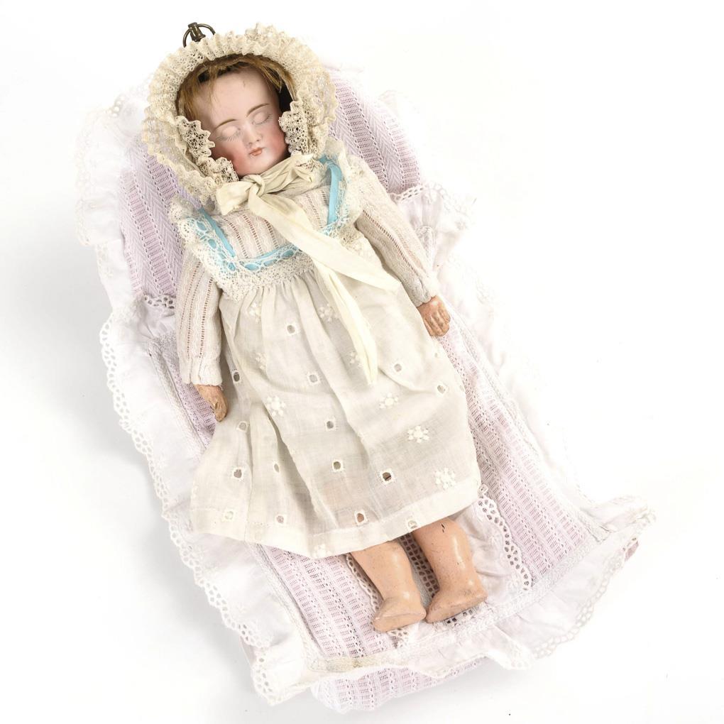 Drehbarer Biskuitkopf mit Brustplatte aus Masse: schlafend, weinend und lachend. Pappkörper mit intakter Zugstimme, Gliederarmen und -Beinen, Oberschenkel aus Stoff. Weißes Kleid, Haube, dazu Steckkissen. Keine Defekte sichtbar.