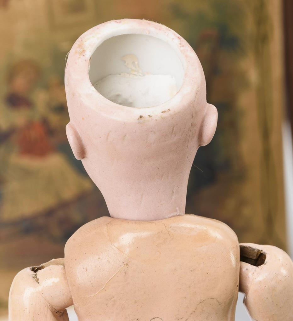 Puppe Simon & Halbig, gemarkt "Globe Baby ges. gesch. Germany S + H 0/1": Porzellankurbelkopf mit festen Glasaugen, gemalten Augenbrauen und Wimpern, offenem Mund mit Zähnchen und Ohren mit Ohrlöchern, blonde Mohairperücke; 15-teiliger Gliederkörper aus Masse (L 27 cm). Originalkarton mit Kästchen (davon einer mit Deckellithographie), darin u.a. verschiedene Spitzen, 1 "Hermelinkragen", Knöpfe, 2 Paar Handschuhe, 2 Paar Schuhe, Unterwäsche, Nadeln, Schere, Fingerhut. Puppe bespielt, wenige Gebrauchsspuren.