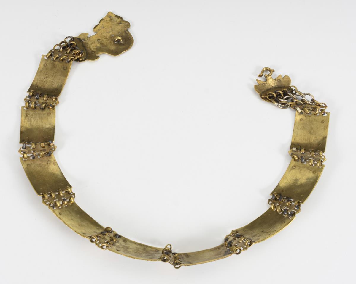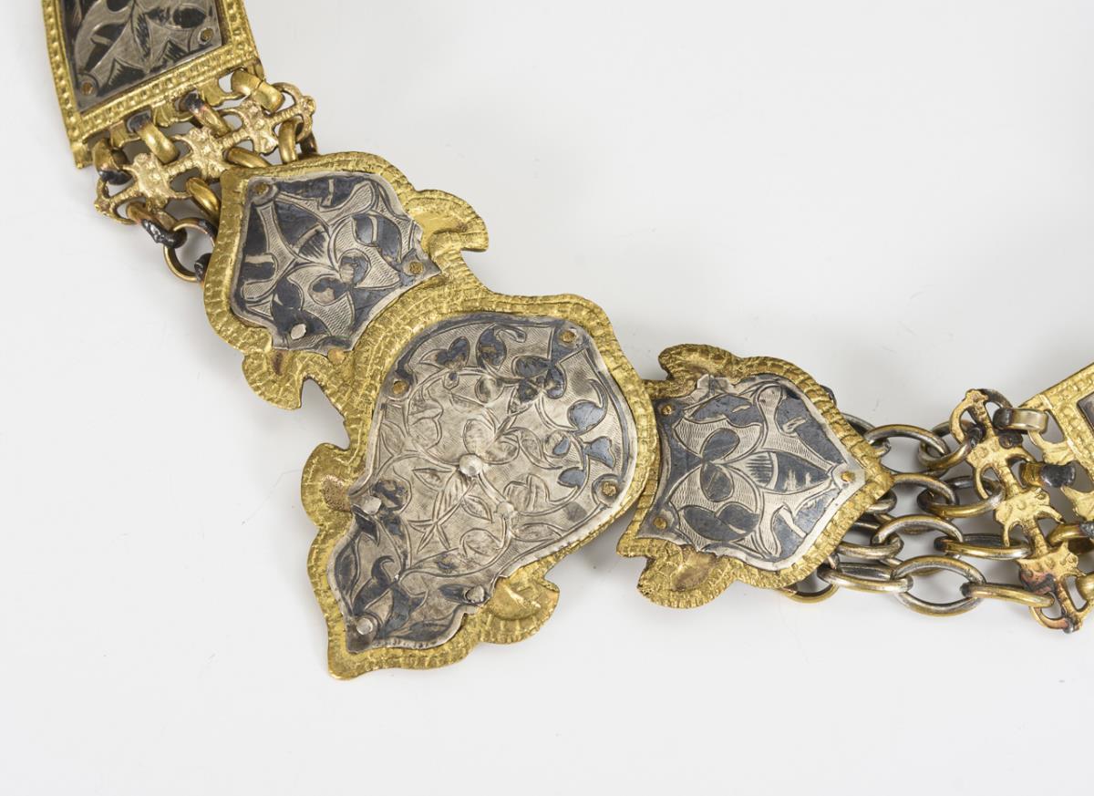 Gliedergürtel mit floral verzierten Silberapplikationen in Niello-Technik. Fehlstellen und Reparaturen am Silber.