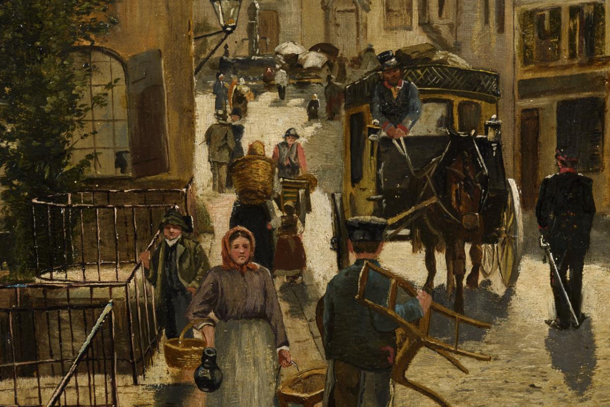 Mehrere Personen und eine Kutsche auf der Straße und der Brücke mit Blick zum Kirchturm der Frauenkirche. Im Himmel retuschiert.