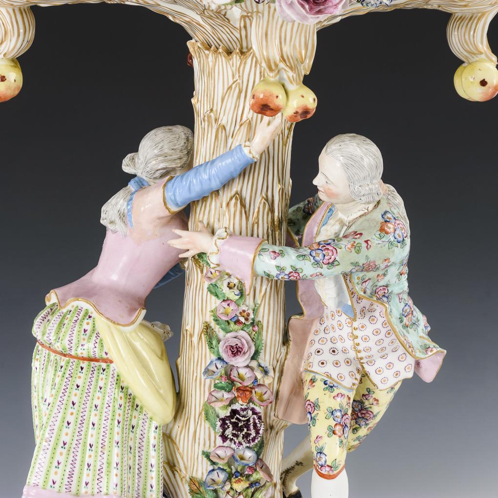 Quadratischer Rocaillesockel, galantes Paar an einem palmenartigen Schaft, großer Durchbruchkorb mit Fruchtabhängungen und Schleifenhenkeln. Mit Montierungsstab. Bestoßungen am Belag und am oberen Sockelrand, rechter Arm der Frau sowie rechte Hand und Hals des Mannes restauriert, Schaft geklebt, Zwischenstück zwischen Korb und Schaft fehlt.