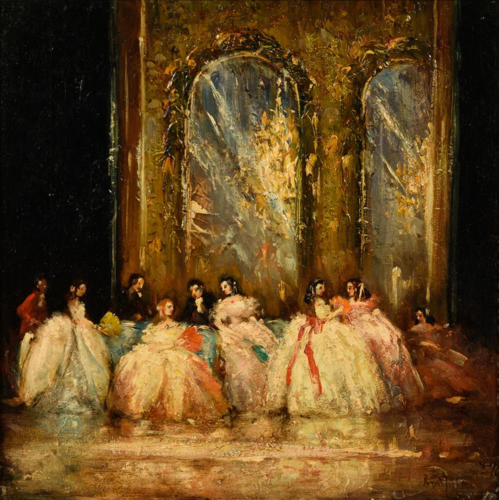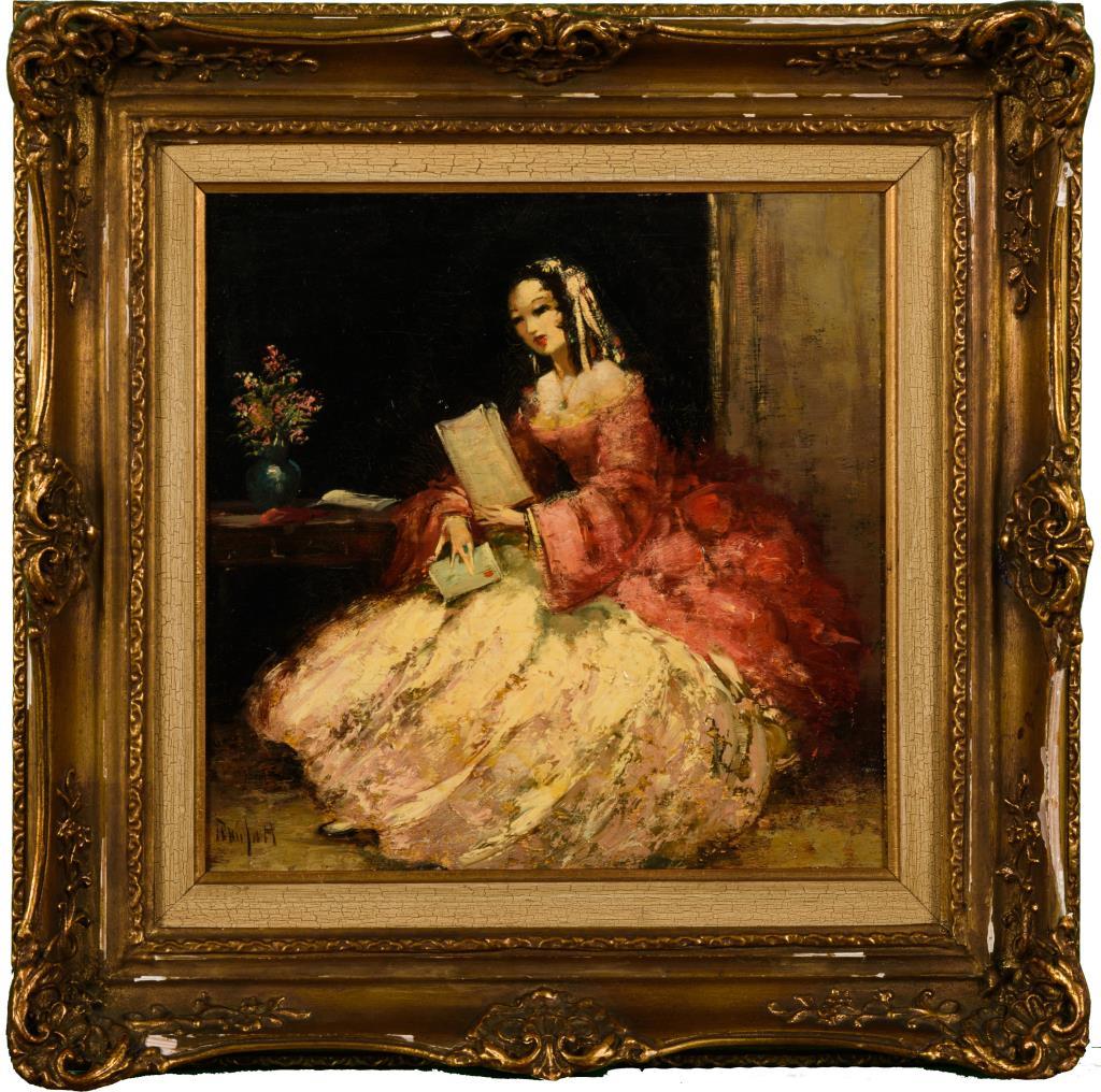 Junge Frau im Ballkleid beim Lesen eines Briefes sowie Ballszene mit Paaren in herrschaftlichen Räumen. Minimale Altersspuren.