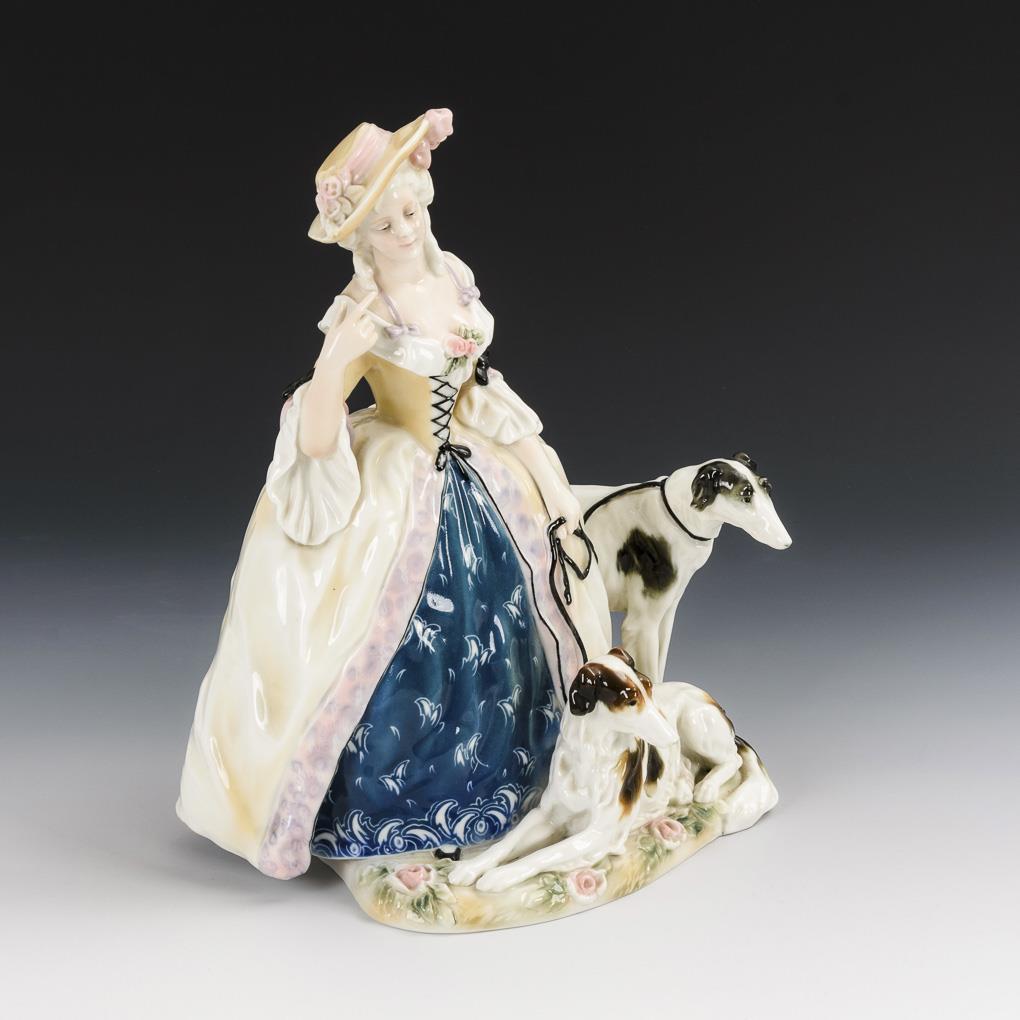 Rokokodame mit Hut, zwei Windhunde an der Leine führend.