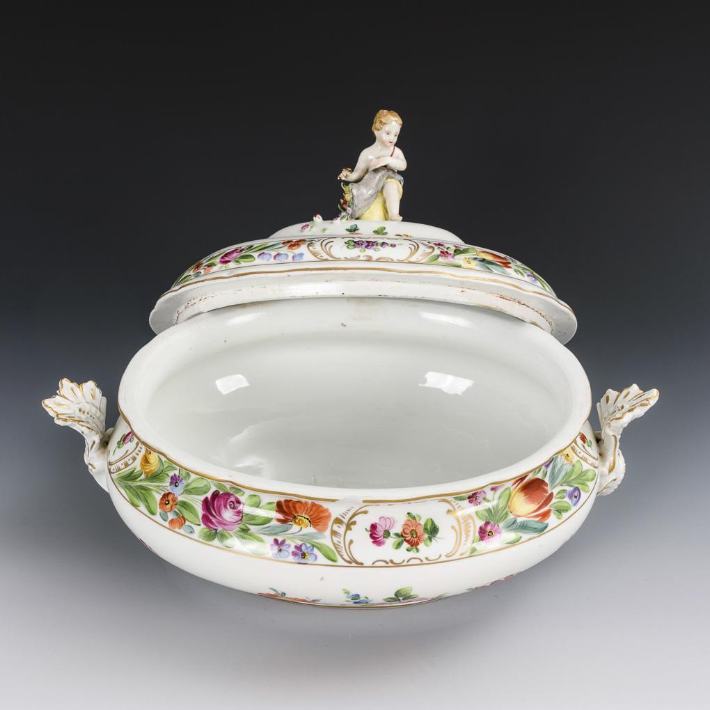 Polychrome Malerei, Goldstaffage. 2 Durchbruchschalen (1x Ø 24 cm, 1x 22,5 x 23,5 cm) sowie 1 ovale Terrine (L 38 cm).
