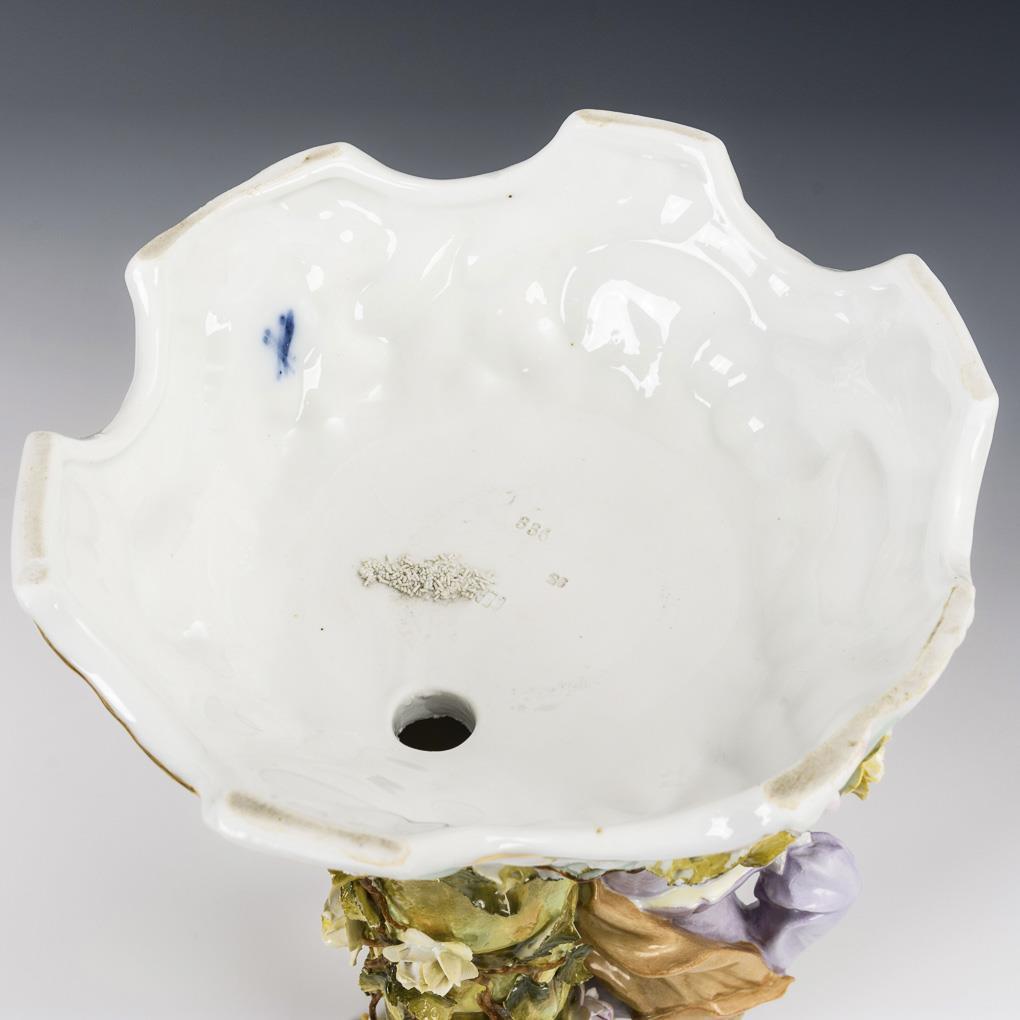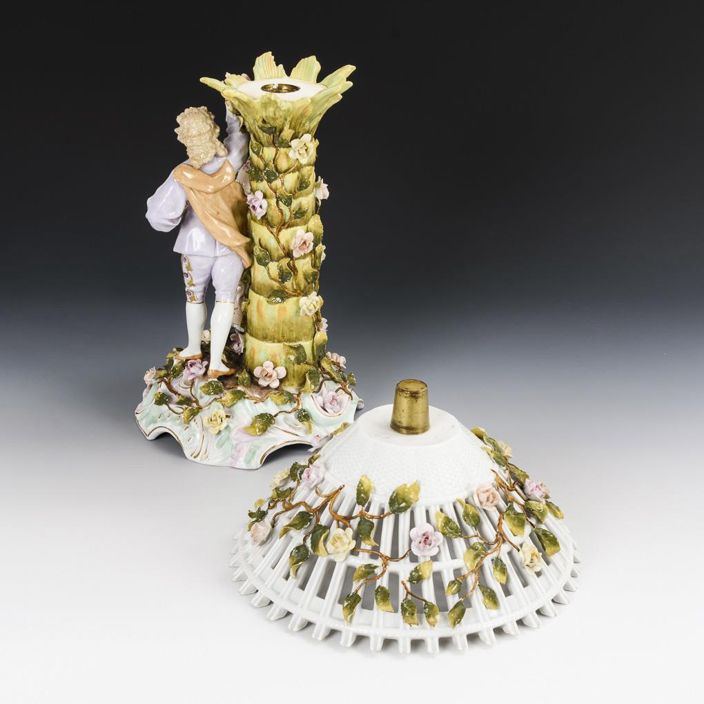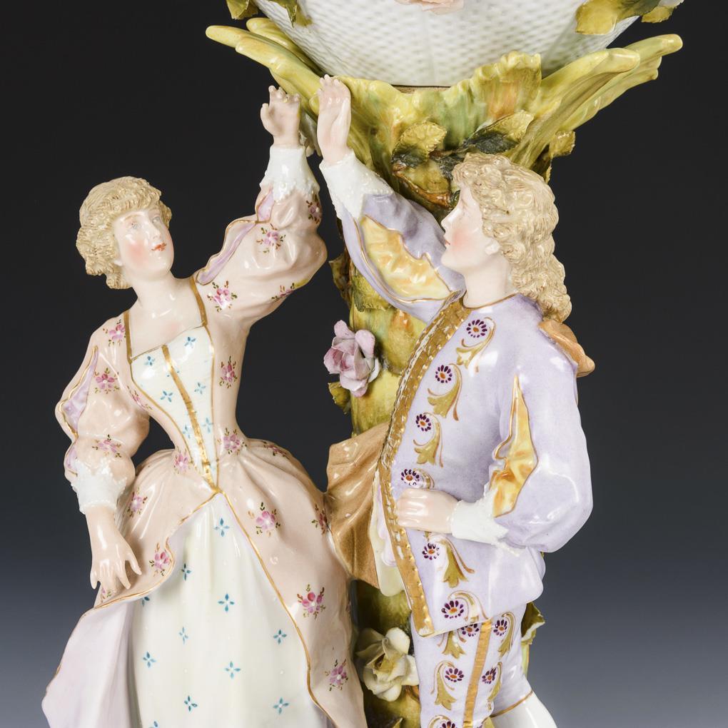 An einem Palmenstamm mit eingestecktem Korb stehendes Tanzpaar, Rocaillesockel, reich mit Rosenblüten und -ranken belegt. Minimale Bestoßungen am Belag, 3 Korbenden bestoßen.