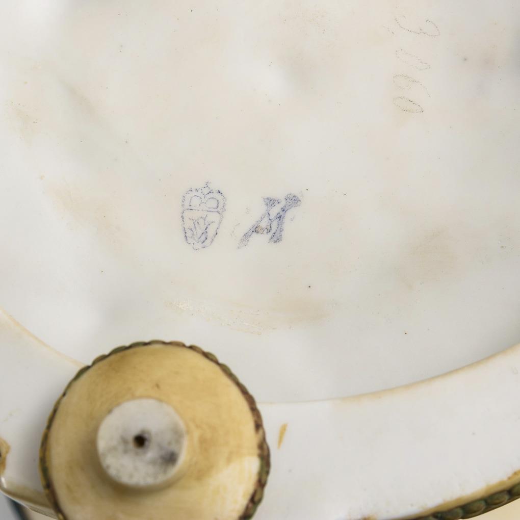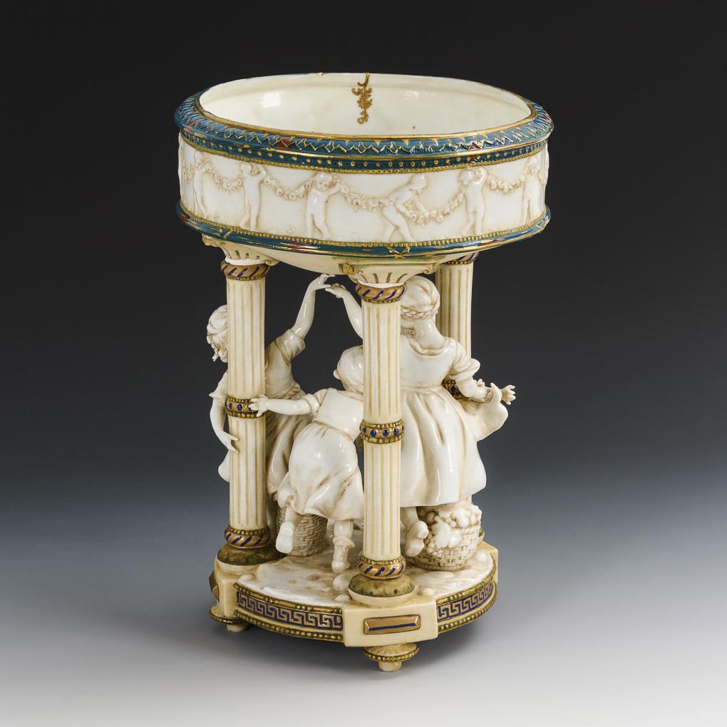 Puttenreliefierte, von drei Säulen getragene Schale, um die Säule vier, einen Reigen tanzende Kinder. Partieller Goldabrieb, 3 minimale Randbestoßungen, Blumensträußchen in der Hand eines Mädchens bestoßen.