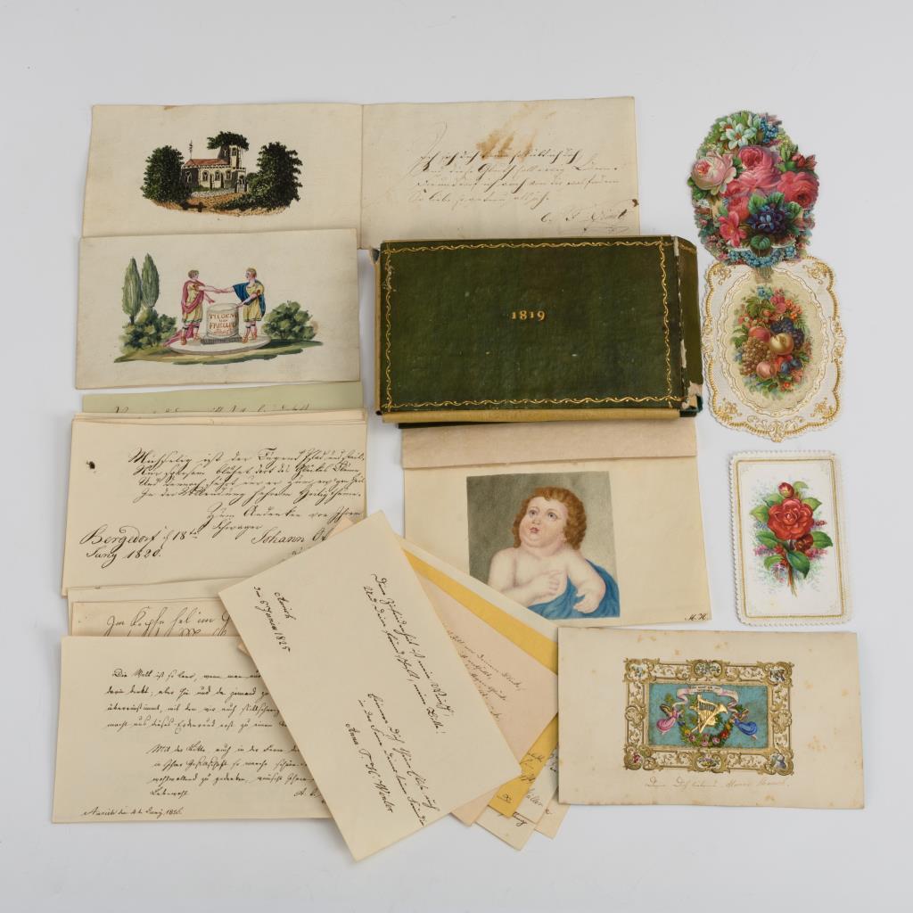 "Liber amicorum" als grüne Papphülle mit Goldprägung "H.H. 1819". Innen ca. 23 Stammbuchblätter (1819 -1844 zumeist Aurich und Bergedorf, darunter 3x mit Aquarell) sowie 4 Luxuspapiere (Farblitografie, teils als Klappbild). Hülle mit starken Alters-/Gebrauchsspuren.