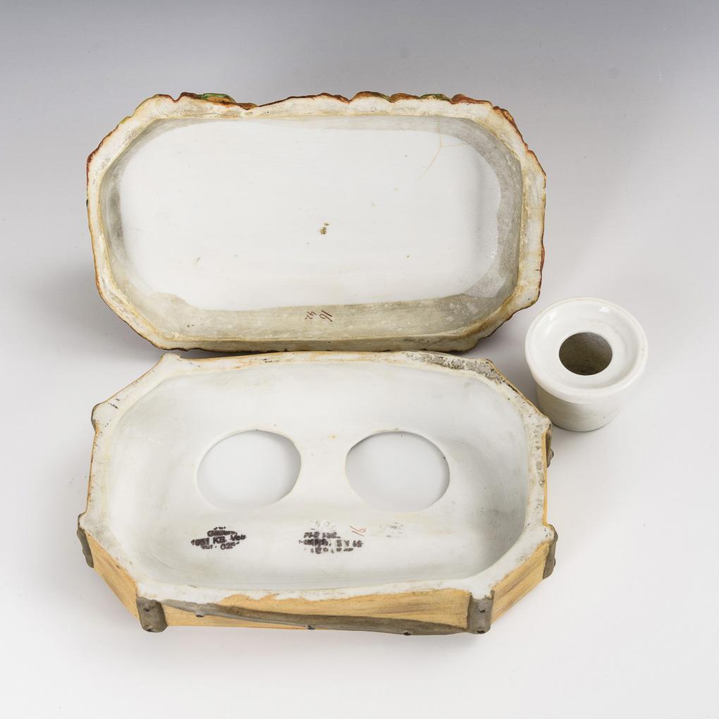 Korpus in Form einer Holzkiste und Deckel in Form eines auf Gras vor einem Hund knienden Kindes. 1 Tintenfässchen fehlt, Hundeohren und Schleifen an der Kleidung des Kindes bestoßen, Gegenstand im Mund des Kindes fehlt, Haarriss in 1 Fuß des Kindes, Haarrissspinne im Deckel.